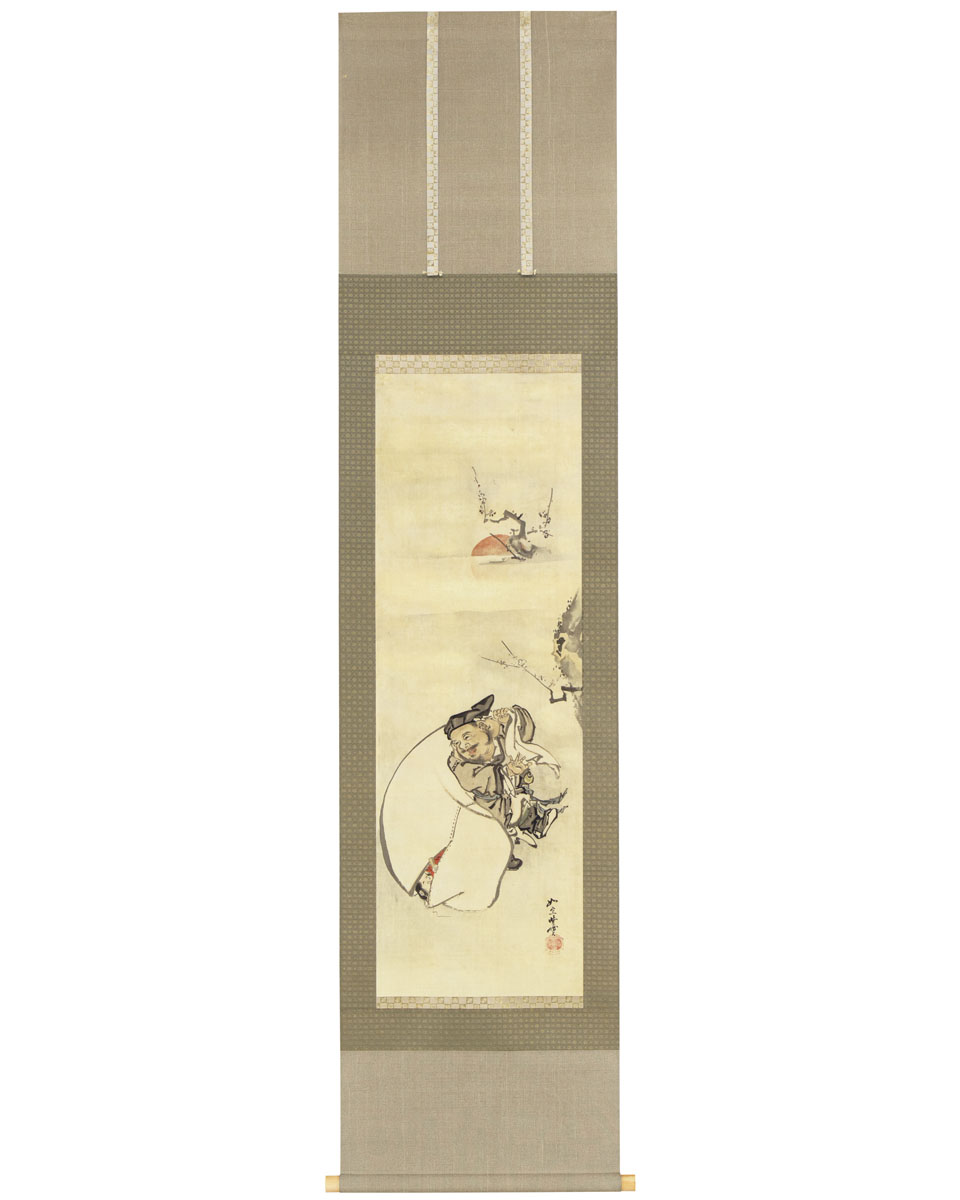 本作には福徳の神・大黒天と、その袋から顔をのぞかせるお多福がユーモラスに描かれています。さらに春の訪れを告げる梅の花と朝日が配され、豊穣と円満、笑顔に満ちた吉祥の世界を軽やかに描き出しています。暁斎ならではの感性が結晶した、晴れやかで縁起の良い一幅です。