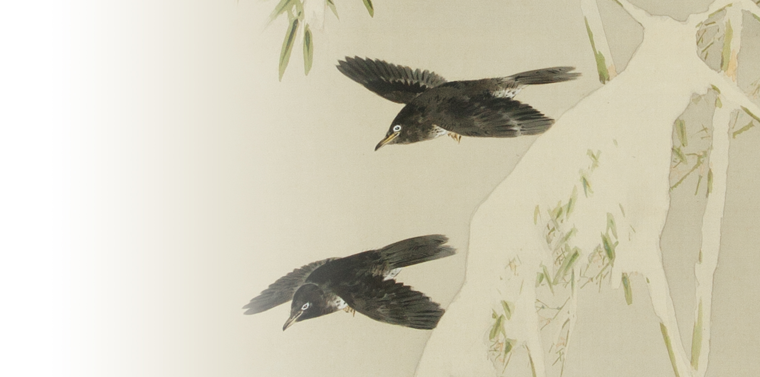 一方で、全体の雰囲気は写実性に乏しく、“クロツグミらしさ”はあまり感じられない(私は初見でクロツグミと分からなかった)。まずは右上のクロツグミの体型と姿勢に問題がある。広げた右翼が上を向き過ぎており、他の部位と合っていない。顔は額が狭くて喉が膨れておりバランスが悪い。加えて、頭と胴体の境がはっきりせず、首が無いように見えてしまう。また、最も印象深い特徴が、この2羽では強調されていない。クロツグミと野外で出会うと、体の黒さよりも、嘴とアイリングの鮮やかな黄色が目につく。しかしこの2羽については、嘴は黄色が控えめで、アイリングにいたっては白く描かれてしまっている。クロツグミは別作品(黒鶫に木瓜・山桜:迎賓館赤坂離宮七宝額下絵)にも描かれているが、こちらはアイリングの黄色がはっきりと描かれているように見える(ただし翼や腹の色彩描写は本作の方が優れている)。省亭は本作では何かしら意図があってアイリングを白く描いたと思われる。
