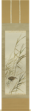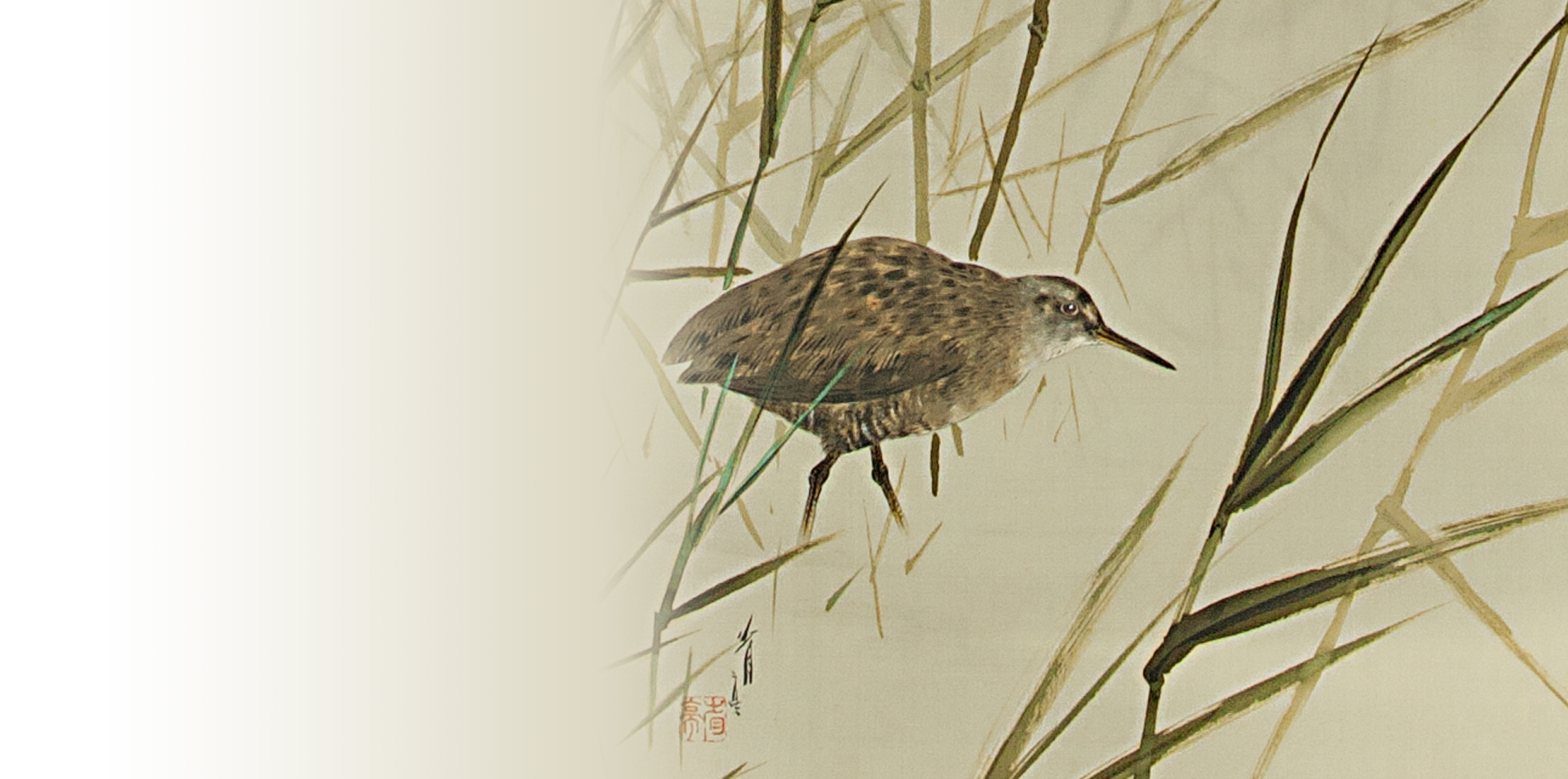 水辺の風景である。手前の葦(ヨシまたはアシ:主に水辺に生え、背丈が3m を超える高茎草本)は暗緑で濃く、奥の葦は薄墨でかなり淡く描かれており、奥行きを感じさせる。葦は疎らで背丈はそれほど高くない(1.5m 程度だろうか)一方で、下草は全く無く、ここが当に水際であることが分かる。葦の葉は向かって右側へ傾いており、そちらに空間(すなわち水面)なのだろう。左手から1 羽の水鳥が歩き出てきた。この鳥はクイナという。