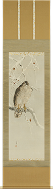 日本絵画の花鳥画の分野で、猛禽類(タカやワシなど)は大人気の題材である。その勇ましい姿を描いた掛け軸は、古い日本絵画を扱う美術館や画廊で必ずと言っていいほど頻繁に見かける。描かれた種類は様々だが(イヌワシ・オジロワシ・トビ・クマタカ・オオタカ・ハイタカなどを良く見かける)、松や枯木にとまったものが多く、鷹匠が用いた木製の台にとまったものや、獲物を追いながら飛ぶ姿のものもいくらかある。権力の象徴として、または幸運の縁起物として、たくさんの作品が近年まで制作され続けたのだろう。