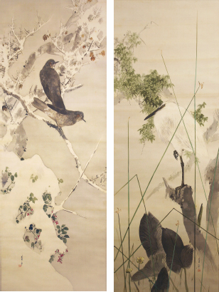 渡邊省亭「青楓白鷺・雪中鵯図」
