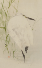 さて、上記の識別難易度を踏まえた上で、省亭が描いた白鷺を品定めしてみよう。そもそも省亭はかなりの鳥好きだったろうから、これらの識別点をもちろん知っていただろう、その前提で話を進めたいと思う。省亭の白鷺は、「十二ヵ月花鳥図 七月」(個人蔵)や「青楓白鷺・雪中鵯図」(齋田美術館)など複数の作品で共通した特徴を持っている。すなわち、①嘴は黒く、②細長い冠羽があり、③足は指先まで黒い。①と②から、この白鷺はコサギのようだ。また細かな識別点だが、口元から目元にかけての皮膚の露出部の色や形も重要で、これらもコサギによく似ている。問題は③である。黄色の足指がコサギの大きな特徴だが、この白鷺は指先まで明らかに黒く、コサギの足とは全く異なる。すなわち、この白鷺はコサギに別種の足を取って付けた “キメラ” のようなもので、現実には存在しない空想の産物になってしまっている。各部位は写実らしく描かれているが、種の識別点として重要な鳥類学的特徴が大きく損なわれているので、全体的な写実性は認められない。