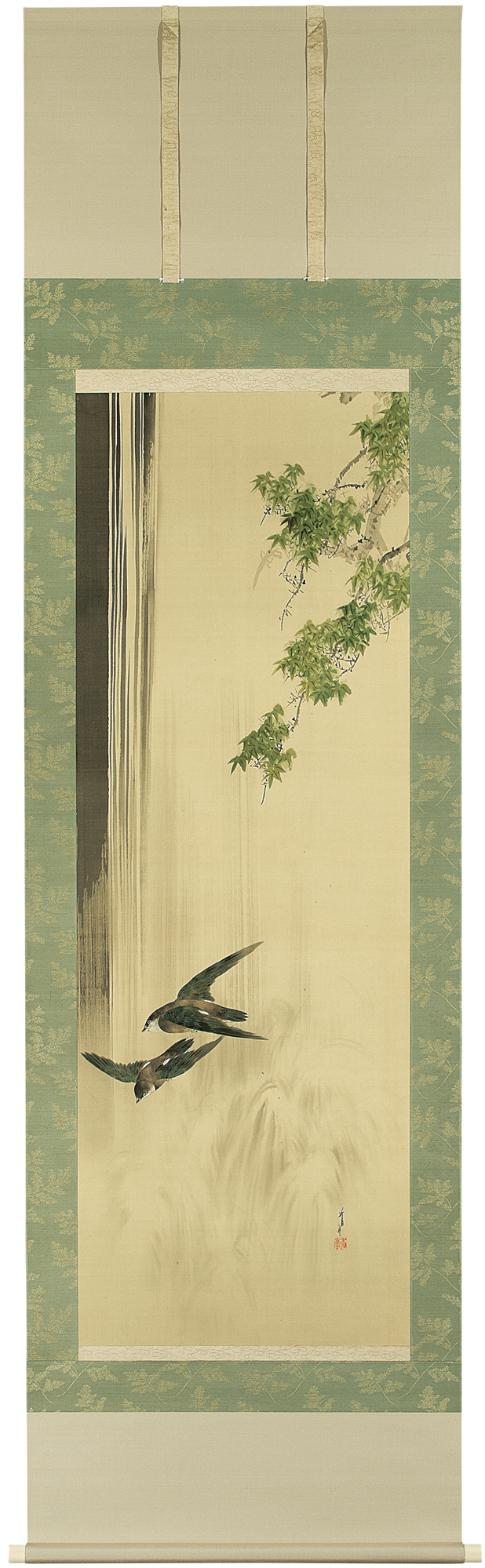 激しく流れ落ちる滝の下部がクローズアップで描かれている。画面下部には岩に当たって流れを変えた水しぶきがあり、上部右隅には緑葉をつけた樹木の枝が伸びている。そして水しぶきの傍らに2羽の小鳥が浮かぶ。この作品は「滝と岩燕」と名付けられているが、彼らはイワツバメなんかではない。鳥の“格”が全く違う。彼らはハリオアマツバメ、世界最速の飛翔速度を誇る、鳥界きってのスピードスターだ。古今東西を問わず、彼らが芸術絵画に登場したのは、これがおそらく最初であり、そして最後じゃないだろうか。
