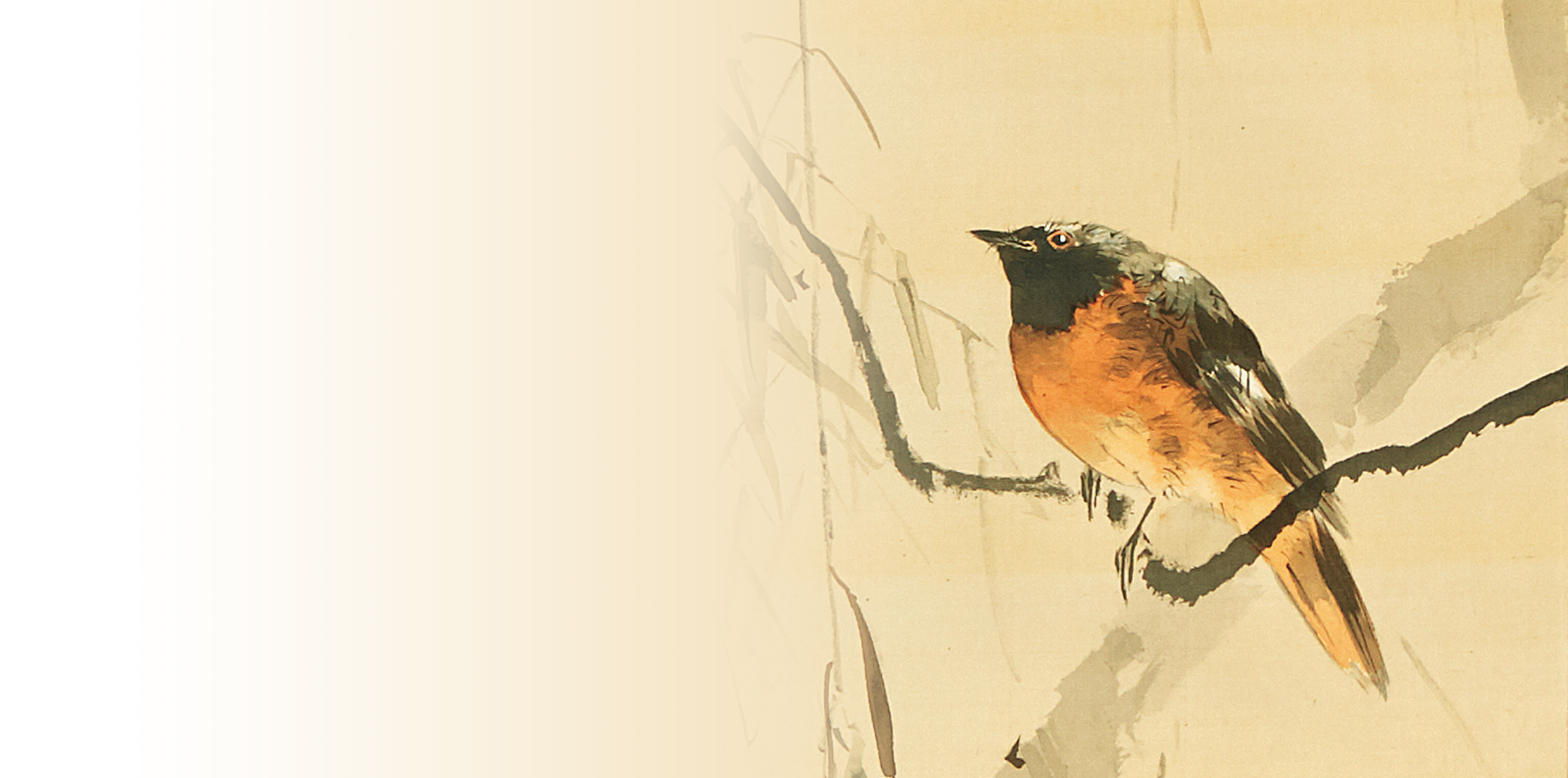 この小鳥はジョウビタキ(体長14cm)といい、東アジアの温帯域に分布する。日本では主に冬鳥として全国に渡来し(最近では長野県などで少数が繁殖している)、北日本や降雪地域ではかなり少ないが、その他の地域では比較的多く見られる。里地や里山で暮らし、都会の公園や社寺林、個人宅の庭先でも出会うことができる、かなり身近な鳥である。彼らの一番の魅力は、なんと言ってもその見た目であろう。大きな頭と目、小さな体と嘴、少し長めの尾と、一般的なイメージ通りの小鳥らしいカワイイ姿形をしている。羽色は雌雄で大きく異なり、雌は全身が薄茶色で、腰と尾の一部だけが明るい橙色に染まる。カワイイ顔にシックな装いの“オシャレなお嬢さん”である。対して雄はかなり派手だ。銀色の頭に、黒い顔と翼、橙色の腹と腰と尾を持ち、翼には大きな白斑が目立つ。銀髪に黒い上着と橙色のスーツパンツでキメた“着飾ったジャニーズ系アイドル”とでも言えようか。この雄の外見は画家の制作意欲を刺激し続けたようで、いくつかの絵画作品に登場している。中でも長谷川等伯の「恵比須大黒・花鳥図」(京都国立博物館蔵)や菱田春草の「落葉」(永青文庫蔵)は、時代を代表する秀作である。省亭も気に入っていたようで、本作品だけでなく「桜にひたきの図」(齋田記念館蔵)にも雄のジョウビタキを写実的に描いている。