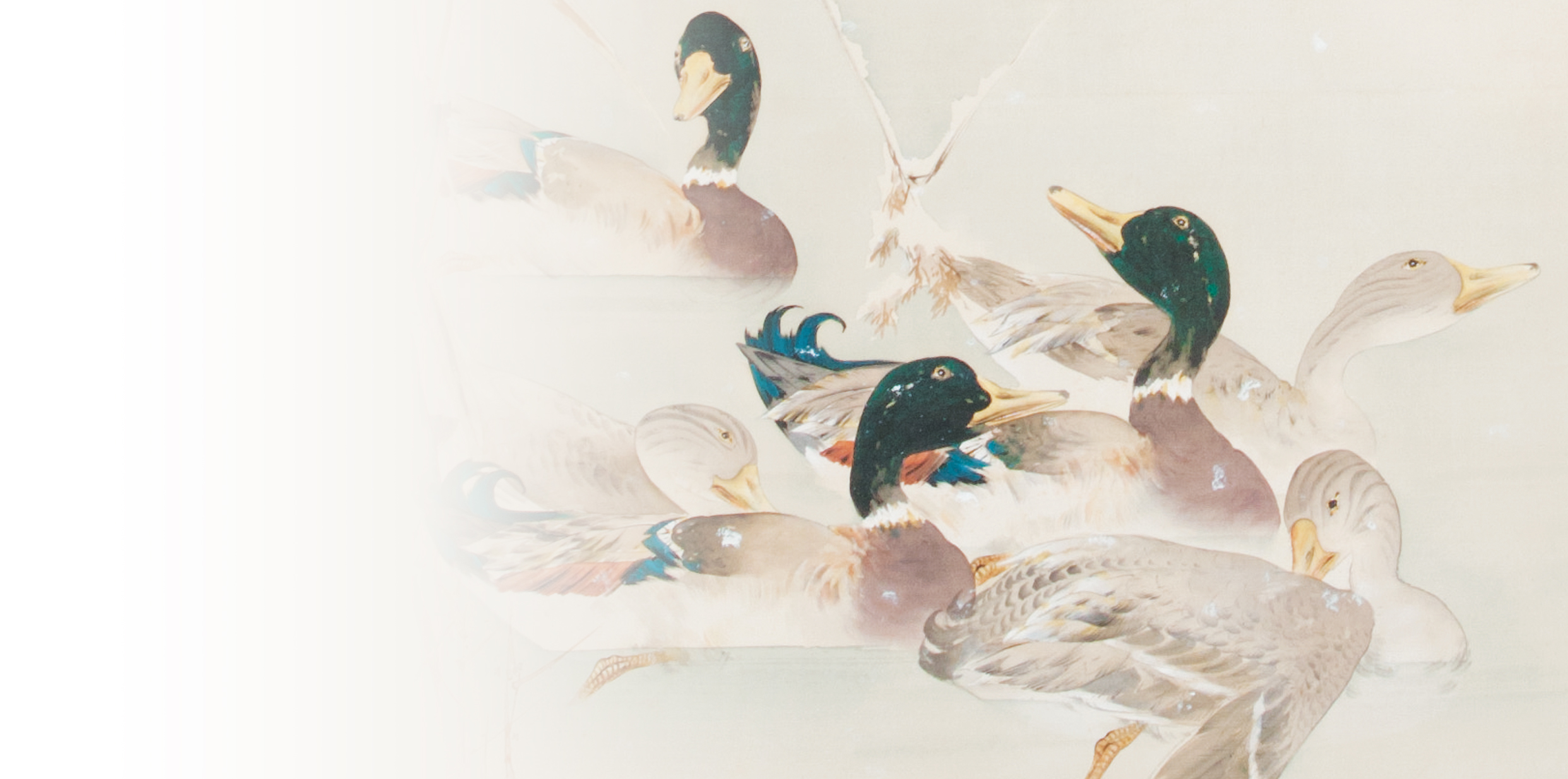 省亭は、雄がエクリプス羽になることを知らなかったのだろうか、それとも意図的にこのように描いたのだろうか。エクリプス羽の4羽は、特に顔の描写が写実性ではなく、あまり省亭らしくない。ここに省亭の何らかの意図を疑ってしまう、評価の難しい作品だと思う。