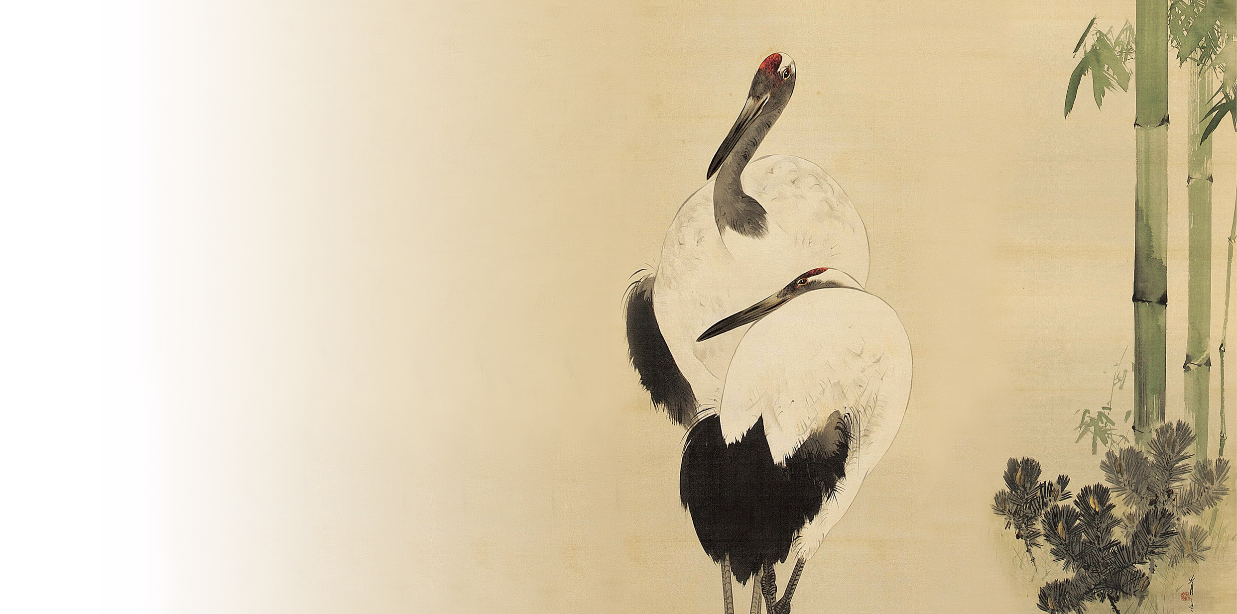日本人なら誰でも知っているだろうタンチョウ(タンチョウヅルとも呼ばれるが、タンチョウが正しい標準和名)は、日本を代表する“おめでたい”鳥である。体は雪のように白く、顔と首と翼の次列風切羽・三列風切羽(誤解されがちだが尾羽ではない)は真っ黒で、頭頂には目立つ赤色部(実は露出した肌)がある。実物は体長(嘴の先から尾の先まで)が140㎝もあり、長い脚も含めると人間の成人男性と遜色ないほど大きい。世間一般の知名度は抜群で、今も昔も、鶴と言えば誰もがタンチョウを真っ先に思い浮かべるはずだ(マナヅルよ、ごめんね)。長寿や夫婦円満の象徴として人気があり、その絵画は“おめでたい”縁起物としてかなりの需要があっただろう。間違いなく、日本の花鳥画の主役である。