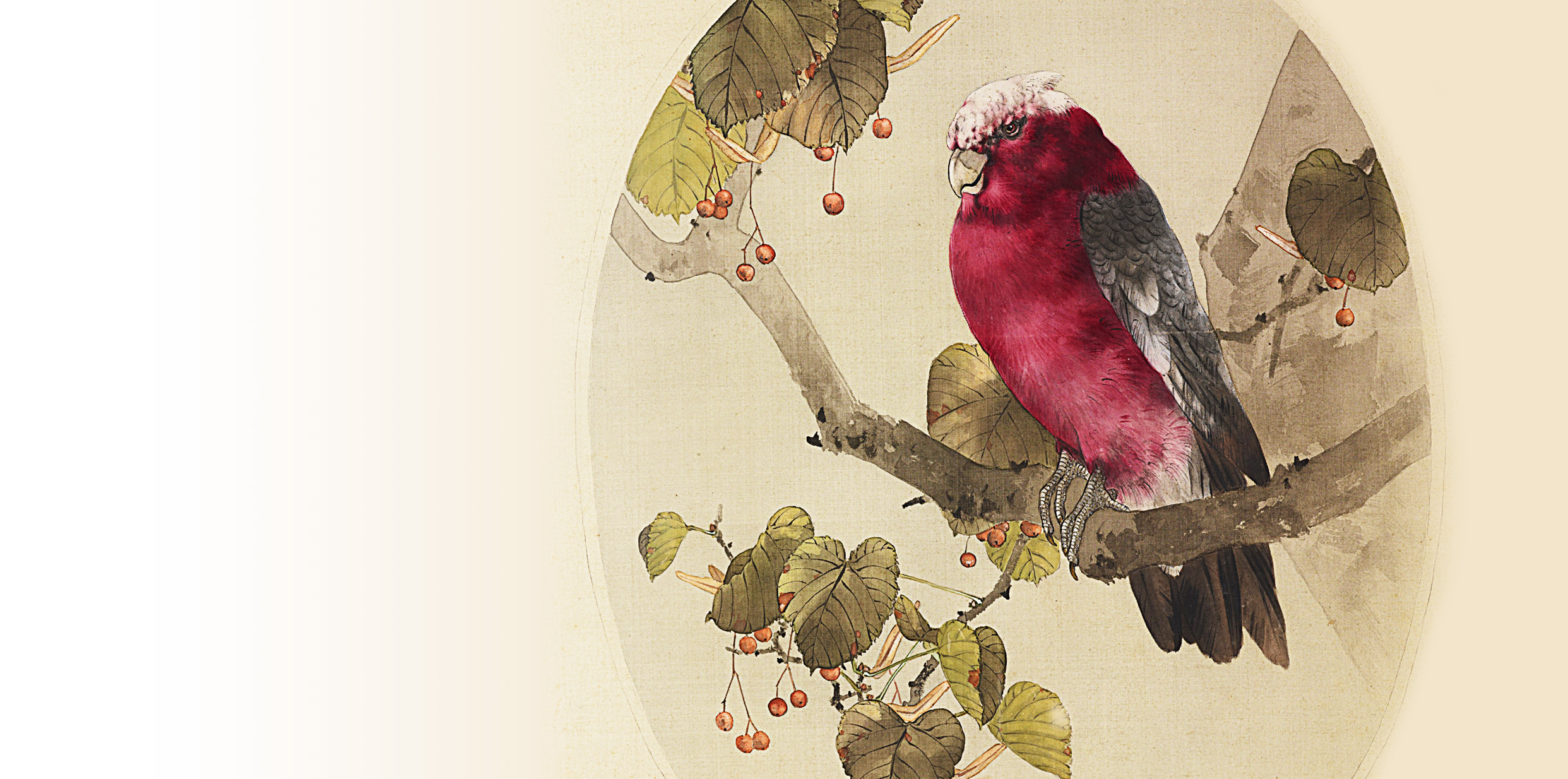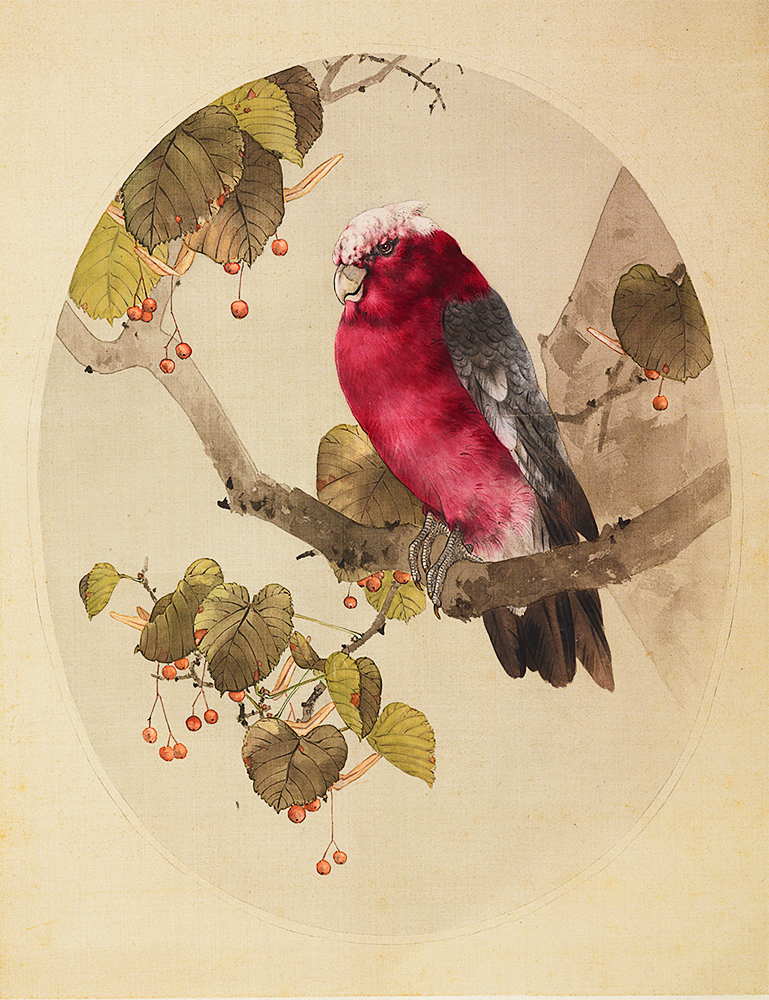 だからこそ、今回取り上げる作品は異例中の異例である。本種はモモイロインコ、オーストラリアに生息する中型のオウムの仲間であり、私が知る限り唯一の、省亭が描いた外国産の鳥である。ちなみに、オウムとインコは近縁だが異なるグループで、オウムは頭に冠羽があるがインコには無い。モモイロインコはインコと呼ばれるが小さいながらも冠羽を持ち、れっきとしたオウムの1種である(和名の付け方を間違ったのだろう)。本作品は、鮮やかな薔薇色の体、頭頂の淡い冠羽、大きな嘴、前向き2本と後ろ向き2本の足指など、モモイロインコの身体的特徴を正確に描写している。おそらく省亭は実物をじっくりと観察して描いたのだろう。