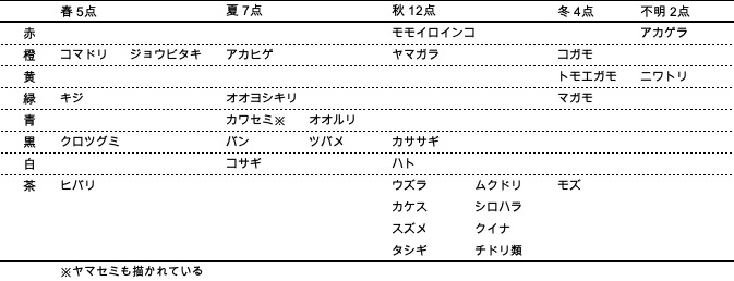 次に、鳥の中心的な色でさらに分けてみる。例えば、アカゲラは体の大部分が白黒だが頭と尻の赤色部が目立つため赤い鳥とし、コガモやトモエガモは顔の色が目立つのでそれぞれ橙色と黄色とする。一方でバンは赤い嘴が目立つけれども黒い鳥とする。このような感じで30点を再度振り分けると、派手な鳥が少ない日本産鳥類が主なので、地味な茶色の鳥が圧倒的に多かった(10点)。特に秋で多く(8/12点)、草木の紅葉で作品に色彩が加えられていた。次に多いのは橙(5点)、3位は黒(4点)、4位は緑(3点)で、赤・黄・青・白は2点ずつしかなかった。