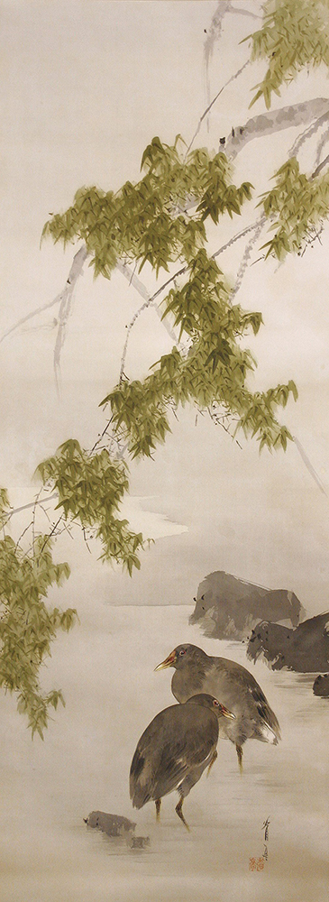 省亭のバンはどうだろうか。本作品では、カエデの木の下の水辺で2羽のバンがたたずんでいる。各部位の色彩や全体のバランスはおおよそ正確に描写されているが、脇の白斑を2羽とも欠いている。省亭らしからぬミスだが、画面全体の色彩バランスを考慮して意図的に省いたのかもしれない。また、古邨のバンとは大きく異なり、動きが全く描かれていない。この2羽は猫背で突っ立っているだけで、将来の動作も全く予感させない。花鳥画では、草木は静を、鳥は動を担い、両者のバランスが花鳥画の芸術性を生み出している。省亭が描く鳥も動を司るが、古邨の鳥と見比べるとやはり静の要素が強く、特に本作品は顕著である。どちらかというと、バンの頭上に展開するカエデの枝葉の方に、動の要素を感じてしまう。