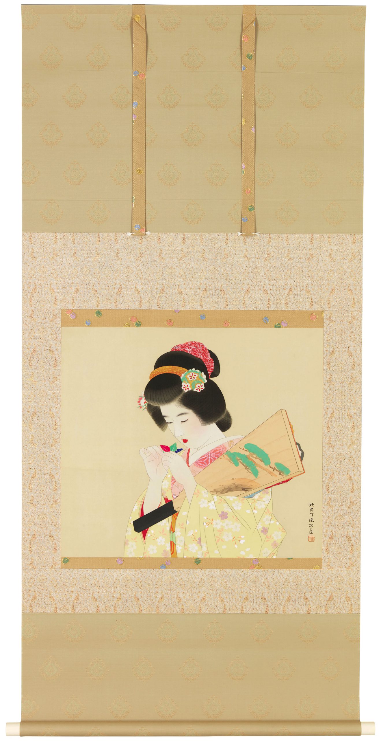 伊東深水は東京の深川の生まれ、深水の過ごした当時の東京は、まだ着物姿の人々が行き交う江戸の香りの残る景色だったと思います。特に深川は江戸時代に「辰巳芸者」と呼ばれる“粋”な芸者さん達がいる事で有名な場所でした。昭和初期までそんな粋な気風を残す芸者さんもまだいらっしゃった花街だったそうです。