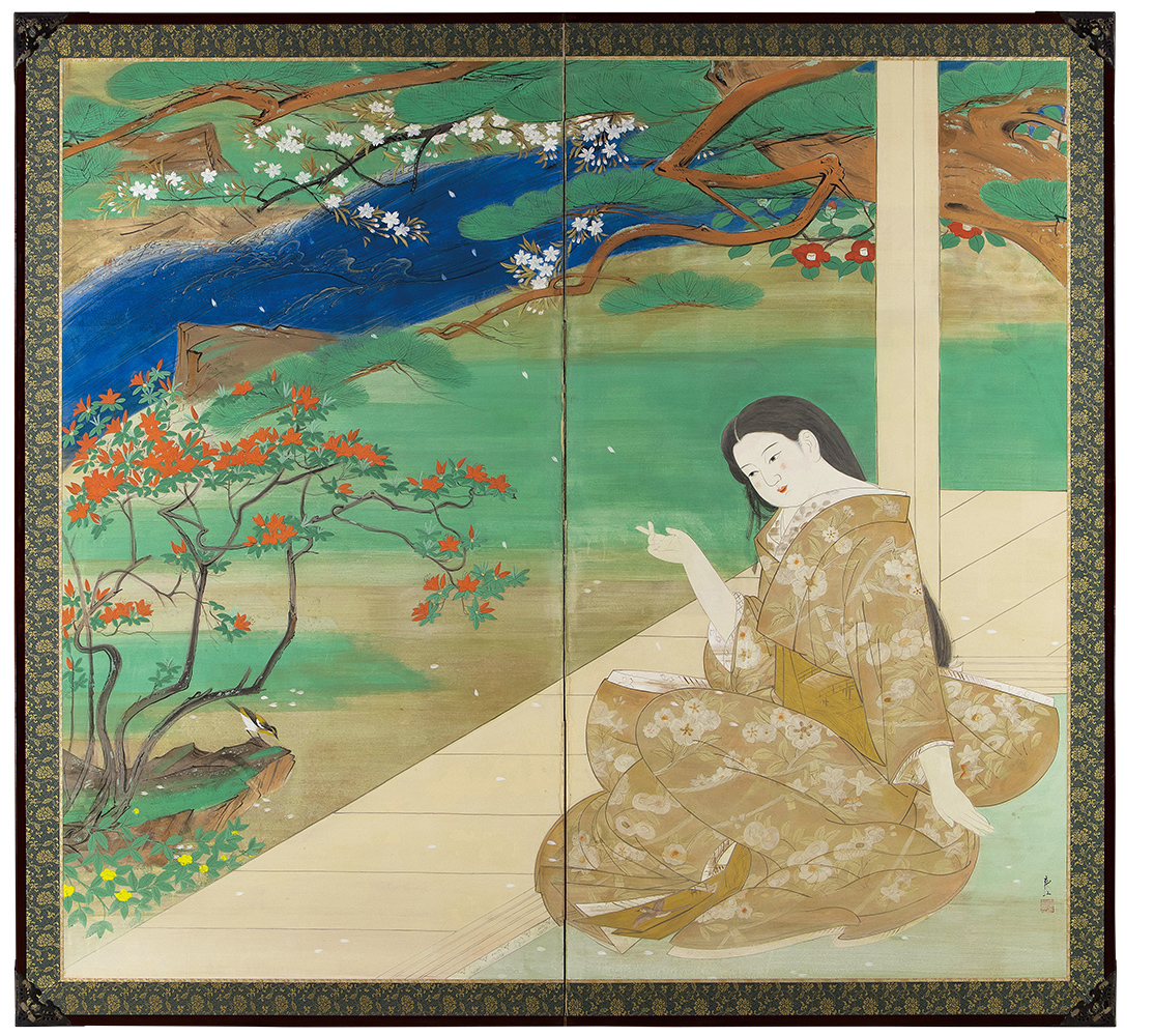 こちらの作品は桜の舞い始めた庭が一望できる縁側で、その景色を楽しむ女性が中心に描かれています。お庭の景色は桜を中心に、松、つつじ、椿などが描かれていて、つつじの下にはキビタキという4月上旬から下旬にかけて日本に渡ってくる黄色い鳥が描かれているので、この作品は4月頃の様子だという事が分かります。制作された年は不明ですが、庭先の色使いの鮮やかさに、明治から昭和にかけて洋画の影響を受け発展をした日本絵画の時代性を感じました。