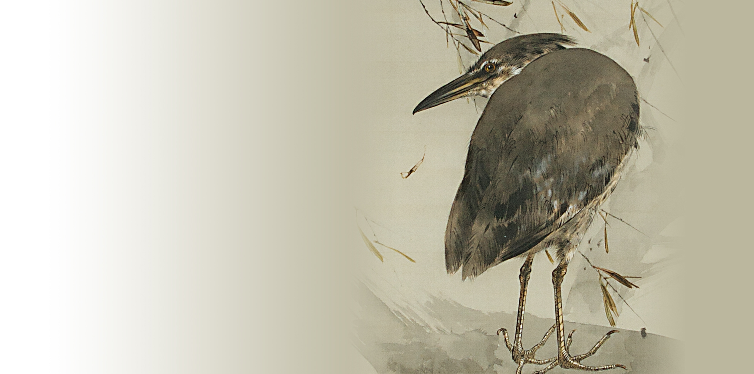 For many Japanese artworks, herons (such as the Grey Herons, the Great Egrets, and the Little Egrets) are popular subject. The Black-crowned Night Herons, in particular, have frequently been painted and there are famous paintings such as “Willow with Heron and Other Birds” by Goshun (Kyoto National Museum) and “Resting on the Wheel” by Takeuchi Seiho (Yamatane Museum of Art). There are two reasons why the Night Herons have been a popular subject. One is simply for its beauty. The adults of the Black-crowned Night Herons have a beautiful color contrast along its body: a blue-black colored head and back, with a pure white neck and belly. Their red eyes and yellow legs also add accent colors. The long thin white crest growing from the tip of its head is glamorous yet serene. “Sophisticated beauty” or “modern beauty” might be an appropriate description for this bird’s beauty. On the other hand, the juveniles of the Night Herons have small white dots on its brown body and has been called “Hoshigoi”(translates random stars). Their beauty is more rustic and simpler, like that of Hagi pottery or Karatsu ware. Nonetheless, both the adults and the juveniles are equally beautiful in monochrome and color paintings.