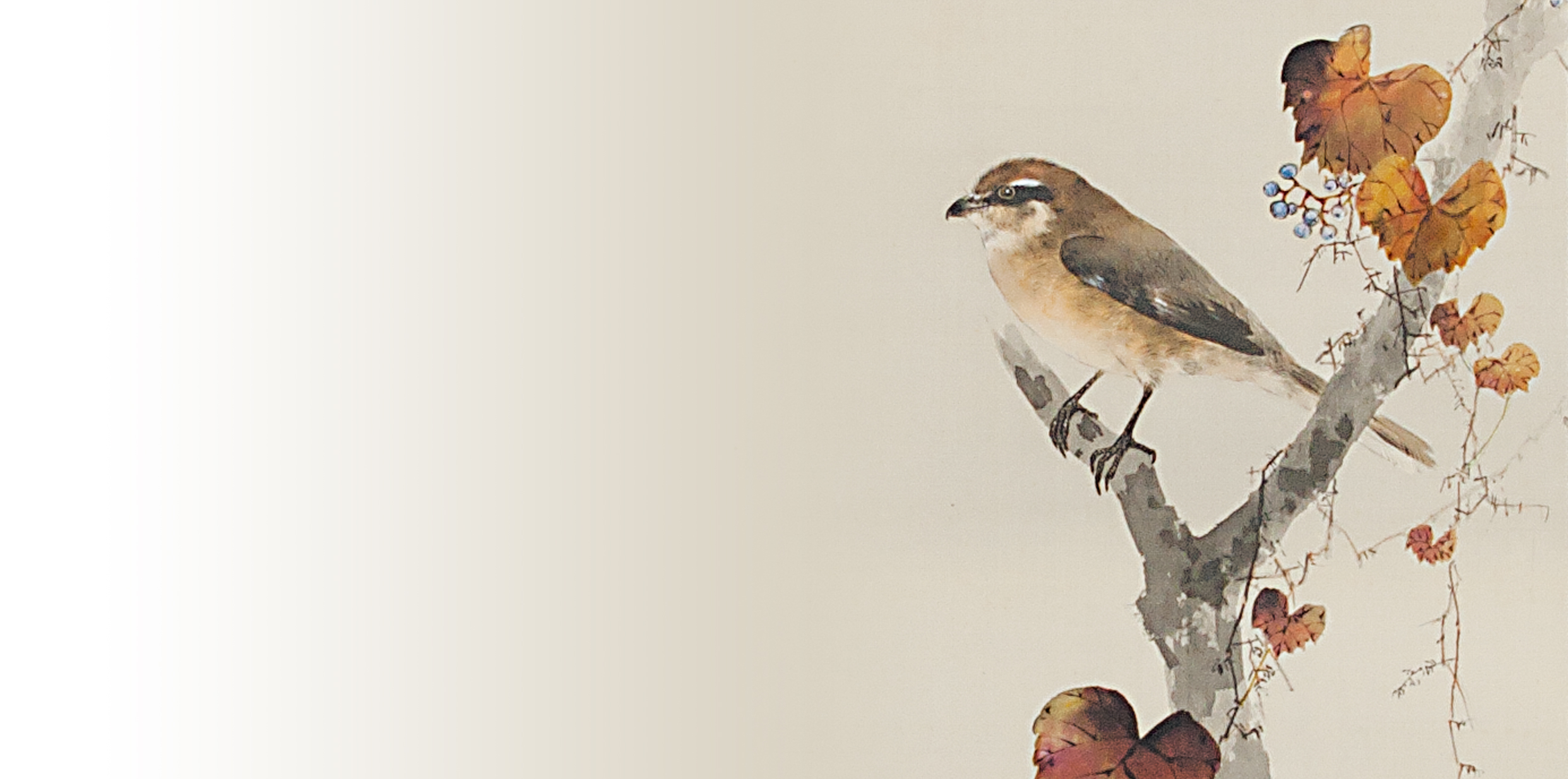 How is Seitei’s shrike like? In this painting, a male adult shrike is perching on a thick withered tree with grapevines. The season is late autumn judging from the withered leaves on the ripened wild grapes. The form and color pattern are painted in perfect realism: the sharply curved hawk-like beak, slender tail, its characteristic black eye-stripe, white spot on the wing, and thin black legs, etc. The body is thick and strong, and the feathers on the head and abdomen seem soft and plump. If you hold a shrike in your hands, you can know his strongness and softness. It can therefore be said that Seitei’s realism which expresses the texture and weight of the bird realistically goes beyond the conventional level.