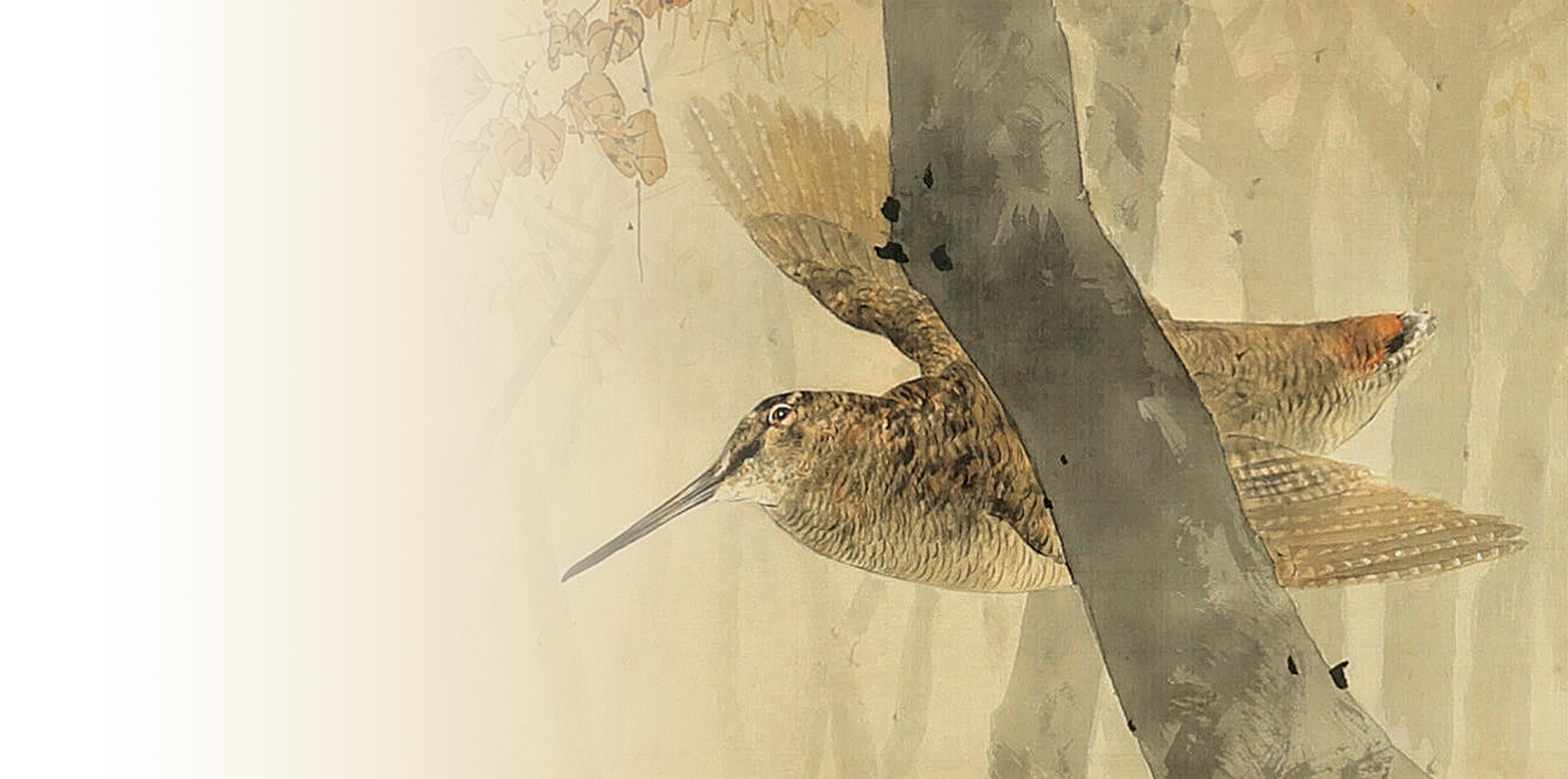 What a maniac bird he painted! This is my first impression upon this painting. This bird is the Eurasian Woodcock (Scolopax rusticola: 34cm in body length) belonging to the family of sandpiper, and they are widely distributed throughout the Eurasian continent from Europe to East Asia. In Japan, they breed in Hokkaido and eastern Japan and spend their winter in eastern Japan and southward. They live in sparse forests and farmlands, and search and eat small animals such as insects and earthworms in the ground by using their long beaks. They have a relatively large population but even ornithologists have few opportunities to meet them, which makes it hard to say they are familiar birds. This is mainly because they are nocturnal and live in hiding so they are not visible. I have only seen them a few times, but when I met one in the paddy field on one winter night, he flew up in surprise, crashed into a pole and fell to the ground (there seemed to be no particular injury, and he flew away safely afterwards). I could not find the “sharpness” and “dexterity” that wild animals usually possess, but found it rather “dull” . Perhaps some people may think that they are “cute” , but they don’t have much factors to gain general popularity and interest.