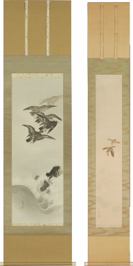 In the first work “Plovers” , five flying plovers are painted. Each feather on their wings is painted accurately one by one, and the head color pattern and eye-rings are also well painted. From the pattern on the face and the length of the beak, they are probably Long-billed plovers. At the bottom of the drawing, we can see the spray from the stream of water breaking on the rocks. The spray looks almost like big waves of the sea, but if the birds are Long-billed plovers, it might be from a river with a rapid stream. This is an extremely realistic work only possible by Seitei.