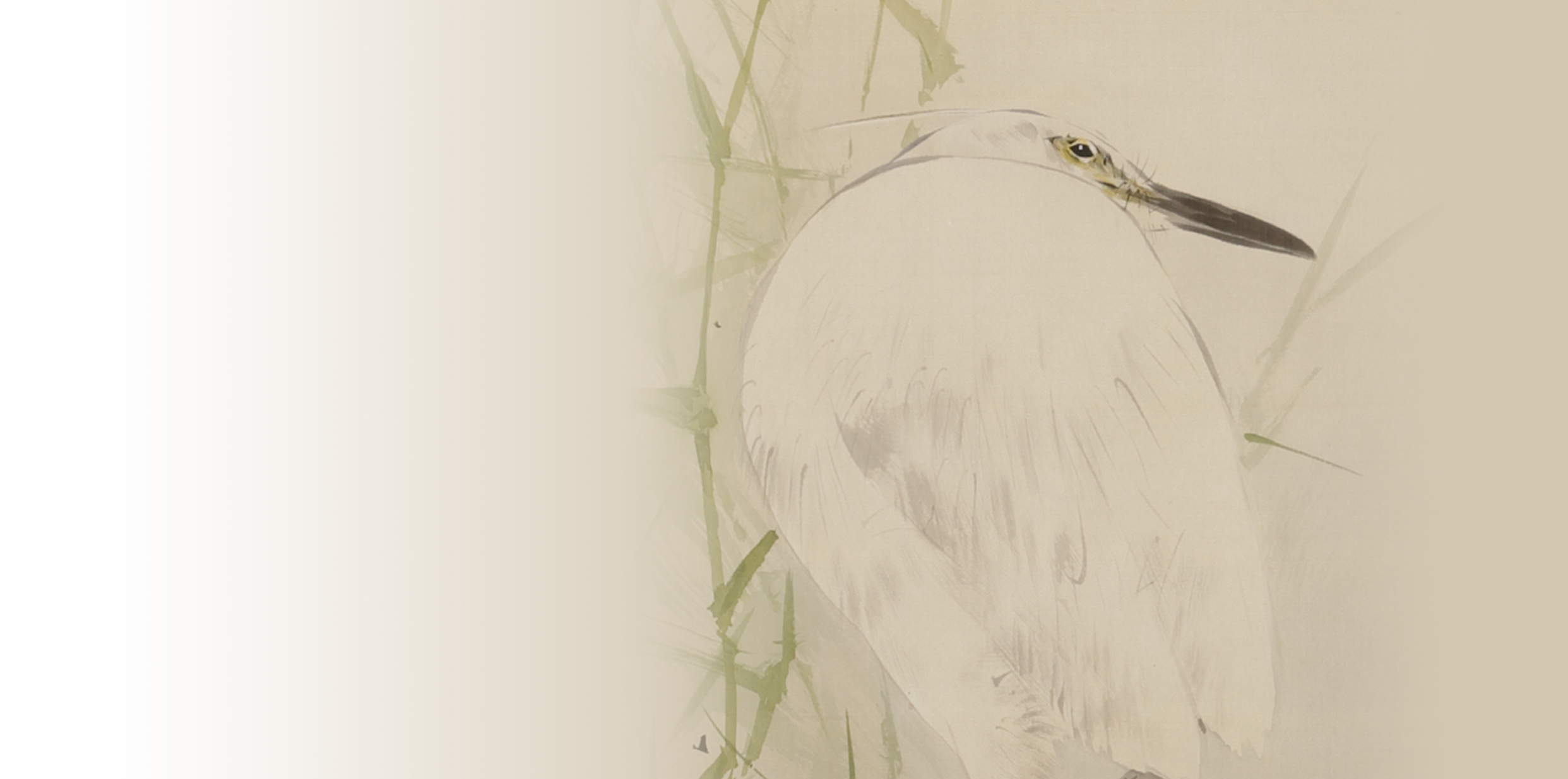 Why did Seitei paint such an egret? He could have easily made it realistic, but why did he choose not to do so? I believe it is because Seitei was an artist who pursued artisticity over realism. In illustrating an egret, the Little Egret would be an ideal model. Since they are familiar birds, there are many opportunities for observation and, furthermore, their long and slender crown feathers make the Little Egret an excellent decorative bird. On the other hand, because the yellow toes will stand out on the soft and calm screen, if its toes were painted in yellow, viewers will focus on the yellow toes first and the presence of the egret will fade. Thus, knowing that it is not accurate, Seitei intentionally painted the toes in black. As a result, the white heron became “chimeric” but its presence and the work’s artistry was preserved.
