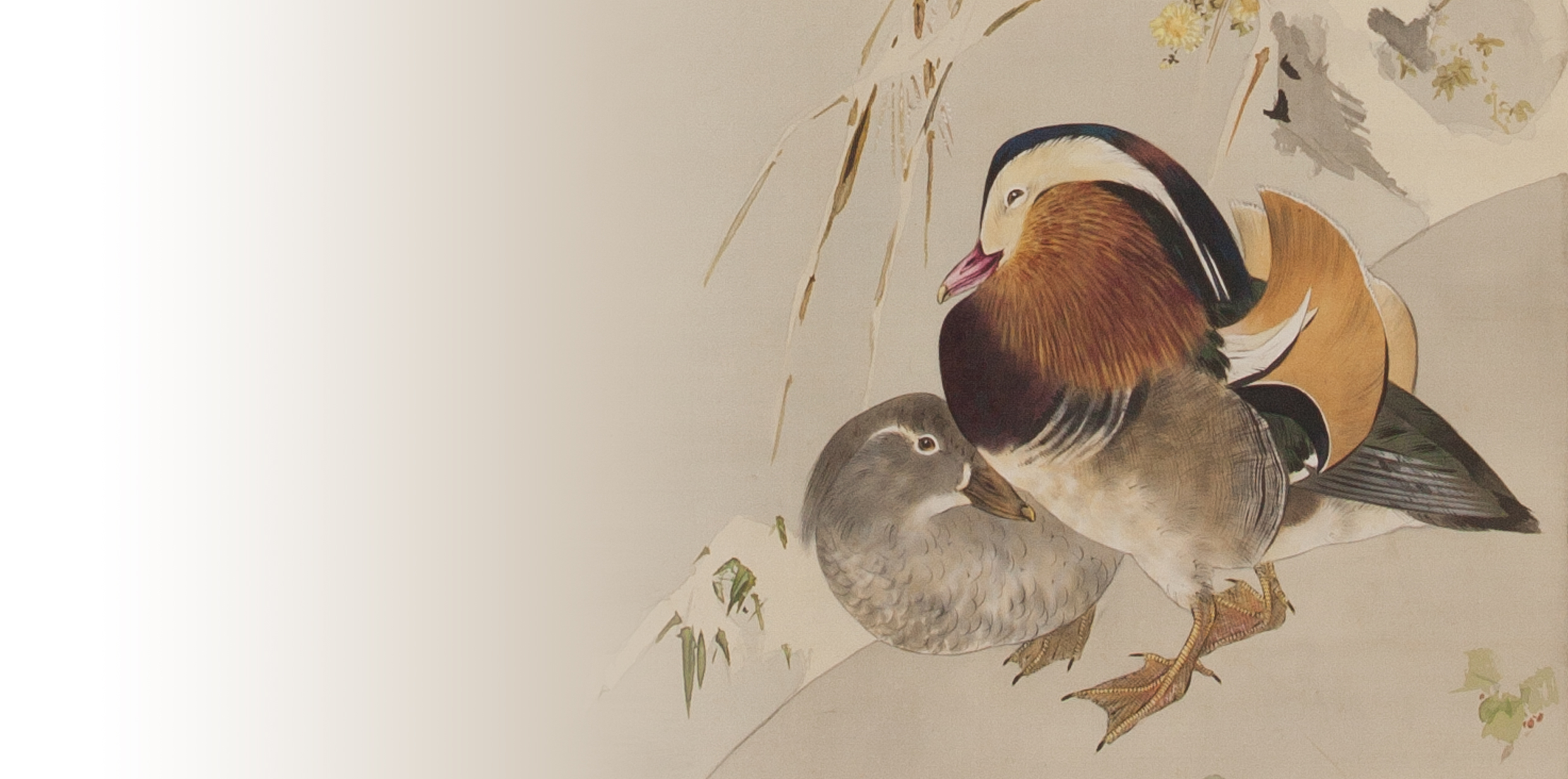 While the ten colored Mandarin Duck is considered an attractive subject for artists, they are a formidable subject to paint. Easily breaking the color balance of the artwork, the Mandarin Duck poses a challenge to the artist’s ability to control and use color. Seitei addressed this challenge by controlling and restricting his use of color. This work is, thus, a testament to his sensitivity to color.