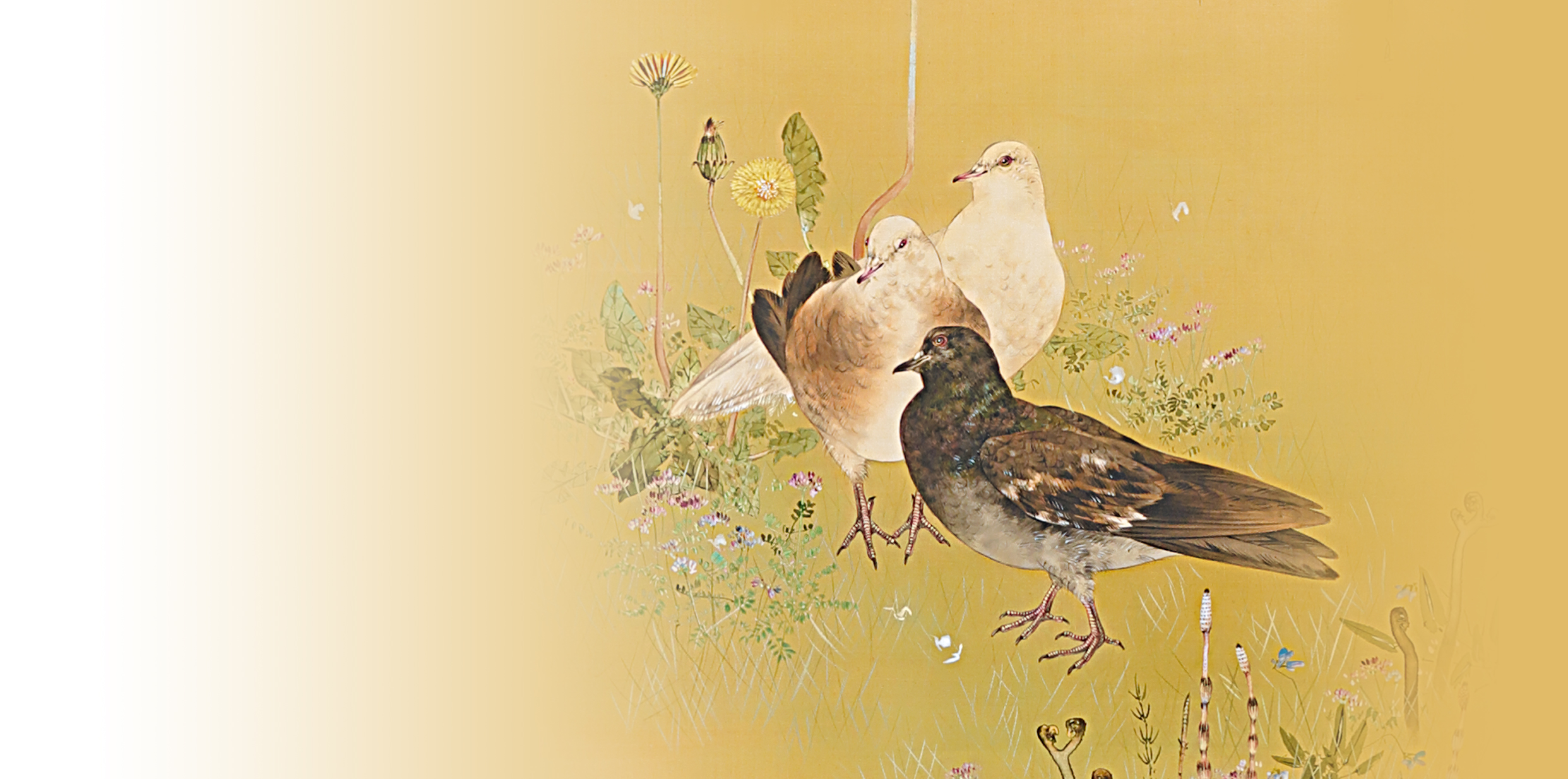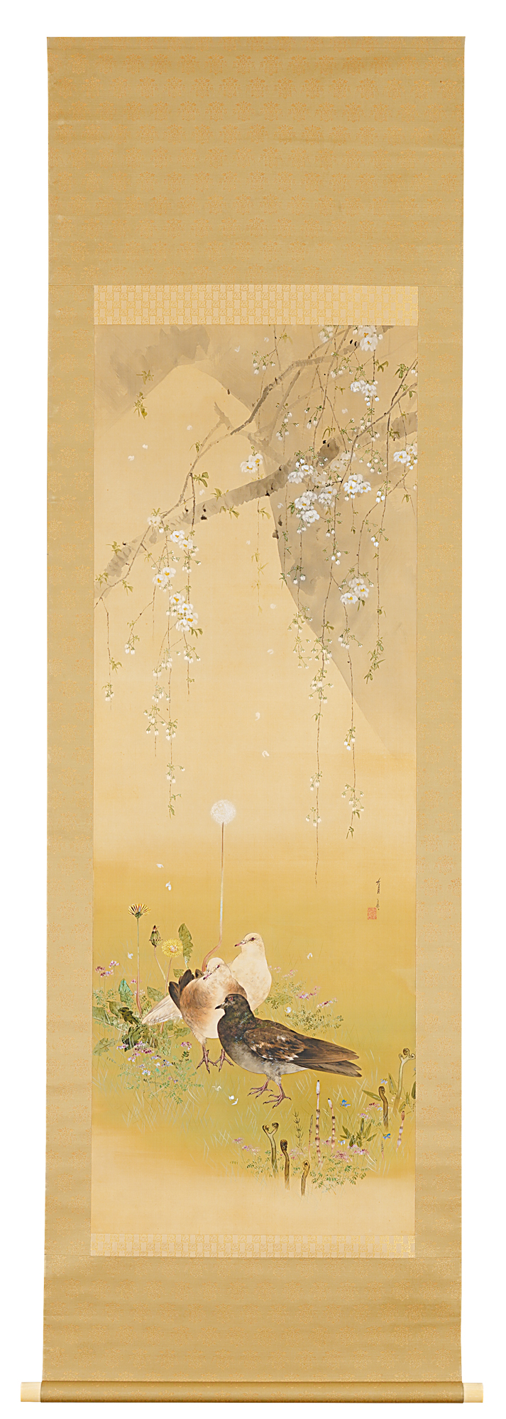 Seitei has made several works of pigeons, such as the highly regarded “Pigeons at Sensoji (Asakusa Kannon Temple)” (Freer Gallery of Art), as well as the excellent “Gingko and Pigeons” (Saita Museum) and “Japanese Maple and Pigeons” (Private Collection). In this work, three pigeons are depicted playing in a spring field, and amongst Seitei’s oeuvre, this work appears to be the brightest and most endearing. As weeping cherry blossoms bloom above, the pigeons are surrounded by ferns and small flowers, such as dandelions, vetch, and violets. With a gentle color scheme and no shading, every aspect of the picture is an emanation of spring at its brightest prime.