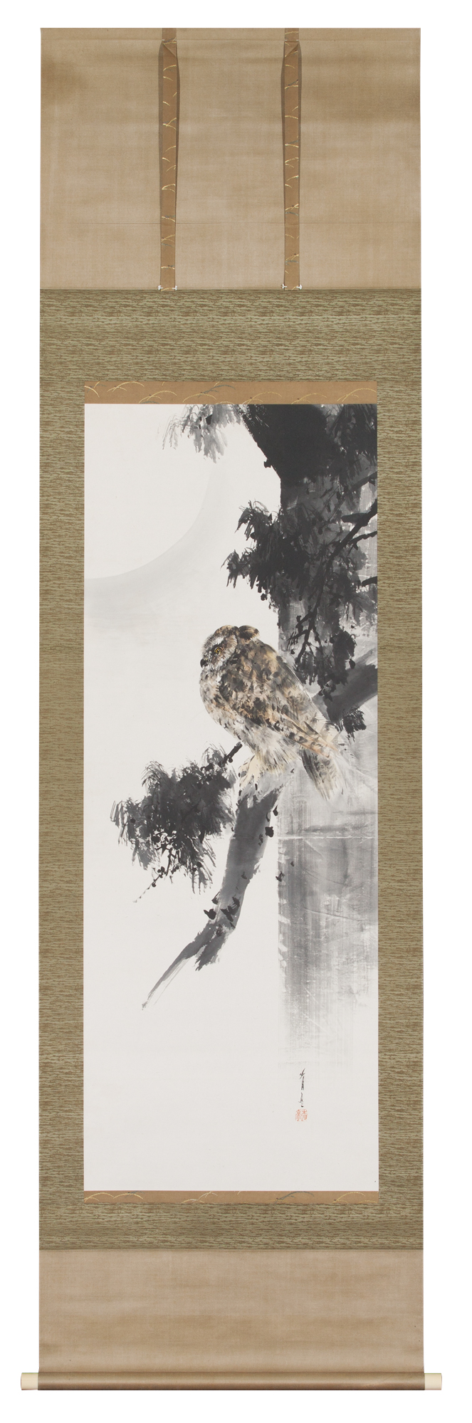 Remarkably, this work depicts the Long-eared Owl through its side. Furthermore, Seitei’s perfected realism captures the owl’s characteristic red-brown body and wings with the innumerous black spots, big ear tufts (an owl’s seemingly ornate ear feathers), red-brown eyes, and legs covered by feathers and, as usual, his depiction leaves no room for complaint. In addition, the back of the owl is expressed with the full complexity of its color patterns, which gifts us the impression of its softness. Finally, its side-profile is depicted with the correct flatness of its facial disc, and its surrounding array of characteristic small feathers is painted in fine detail. This work is emblem to Seitei’s superior drawing technique and excellent sense of color. On an additional note, Seitei also depicts a Long-eared Owl in “Cedar tree and Horned Owl by Moonlight” (Saitama Museum of Art), however, this portrayal is front-faced.