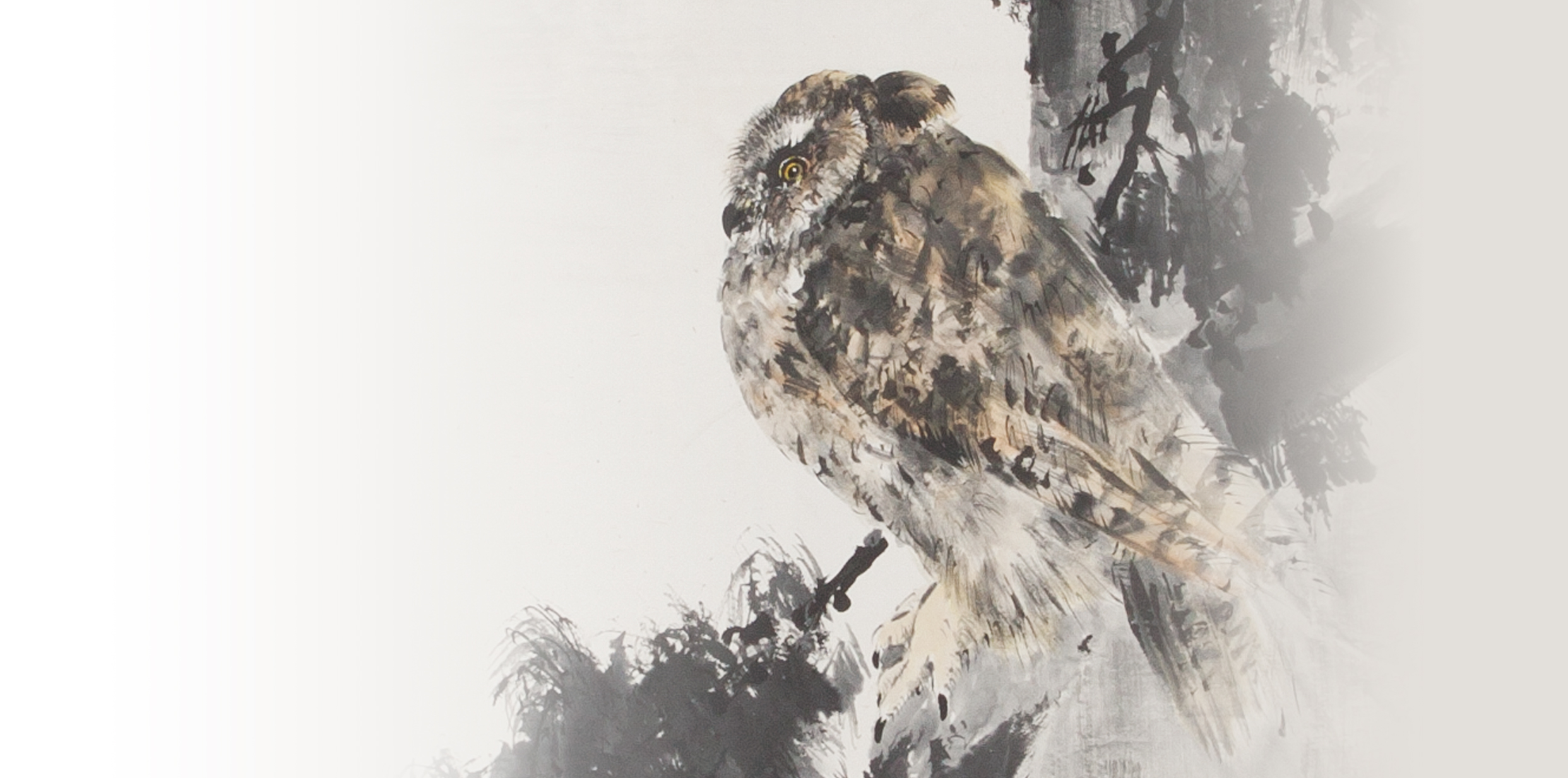 Due to these complications, past painters would rarely depict an owl’s face from its side. In many works, such as Kano Sansetsu’s “Owl and Rooster” (The Nezu Museum) and Maruyama Okyo’s “Shinzan Daitaku Folding Screen” (Ninna-ji Temple), a frontal face would have been planned into the original composition, however, there are cases where it appears unnatural. For instance, Hasegawa Tohaku’s “Buddha’s Nirvana” (Honpo-ji Temple) depicts a scene where numerous disciples and animals gather to mourn tearfully over Buddha’s final death (i.e. Nirvana). Yet, in the lower right corner of the image, a single owl faces, not at the Buddha, but to us, at the very front of the screen. If painted properly, the owl would have been facing the side and towards Buddha, but perhaps even Hasegawa Tohaku found it too difficult to draw an owl from its side.