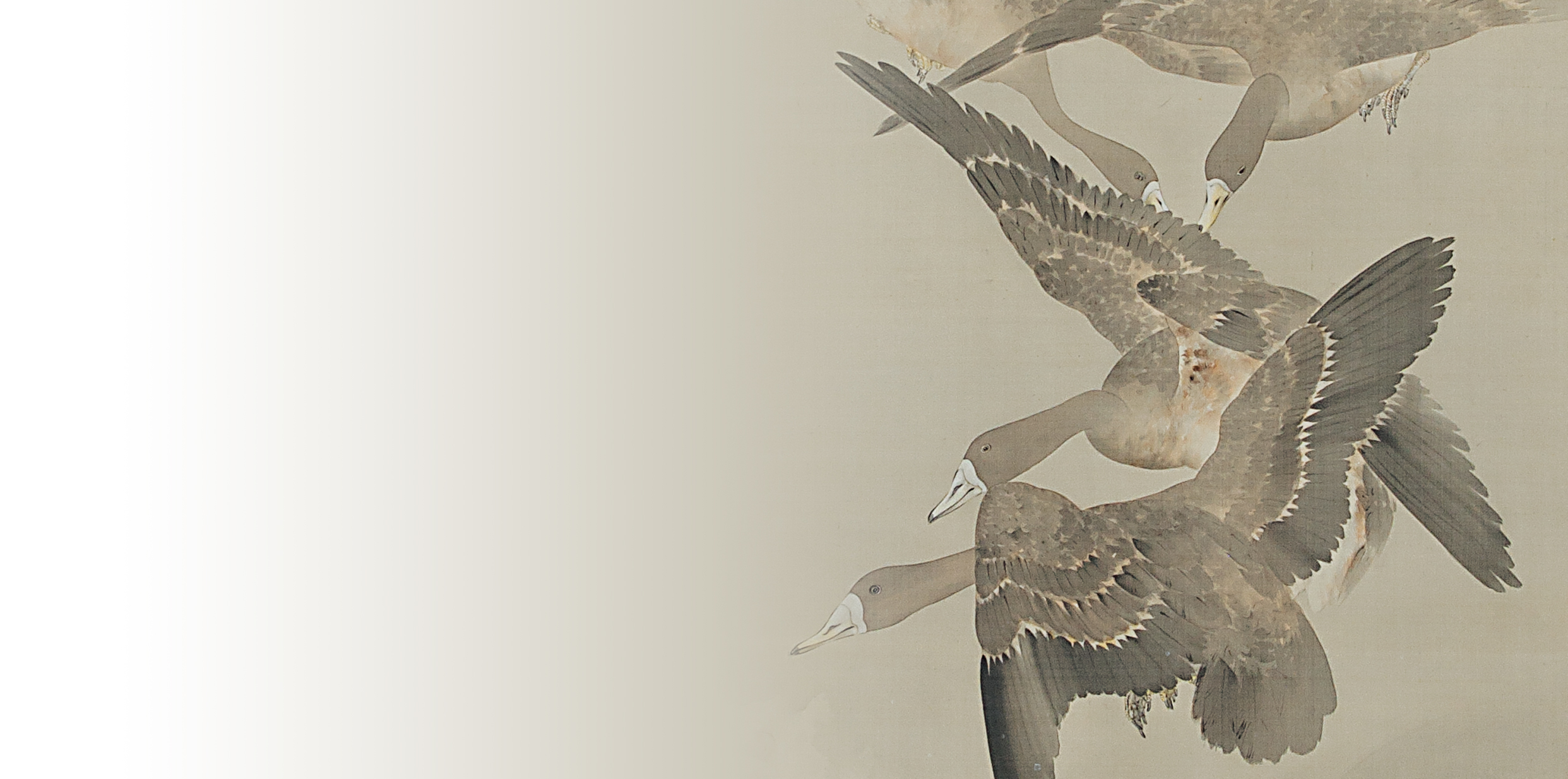 Let us take a closer look at the way these Greater White-Fronted Geese are depicted. The shape and balance of all their body parts is depicted accurately. Their neck and wings are neither too long nor too short, their body is firm, and their tails are thick and short. Above all, their wing feathers are depicted brilliantly. Like the real thing, the large outer flight feathers of the primary and secondary wings are painted black. With much care and precision, each feather is painted with one stroke in differing shapes and lengths, and the number of feathers is roughly correct. Above those feathers, you can see the arrangement of greater coverts and primary coverts, which are painted a deep blackish brown with visible white spots on the outer edge. Further above, the alula feathers and median coverts are depicted also with small white spots on their outer edges. On top, is a row of lesser coverts that is painted a light blackish brown. These variations and color gradations are as detailed as natural history illustrations and handbooks of birds. Furthermore, the pale orange beak and white band on their base, a key feature of the Greater White-Fronted Geese, is well captured, reflecting Seitei’s high skills of observation and painterly realism.