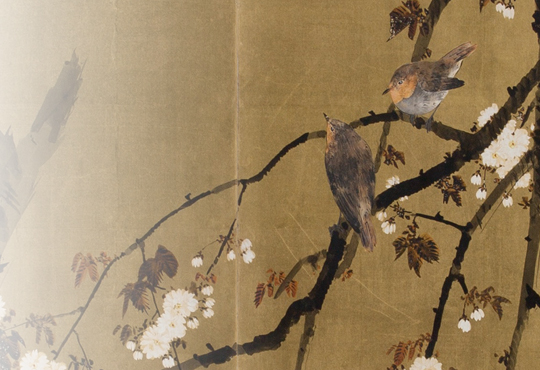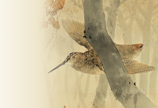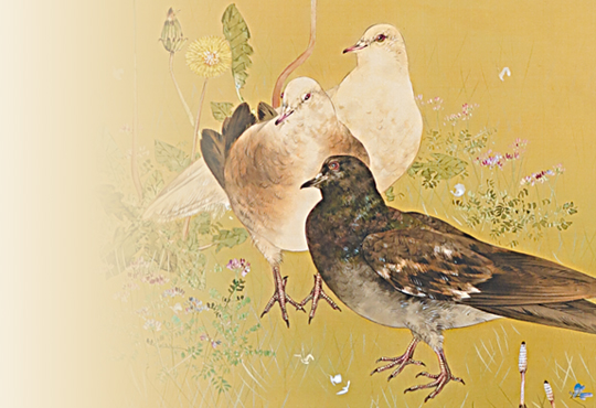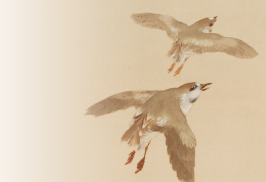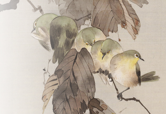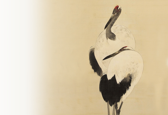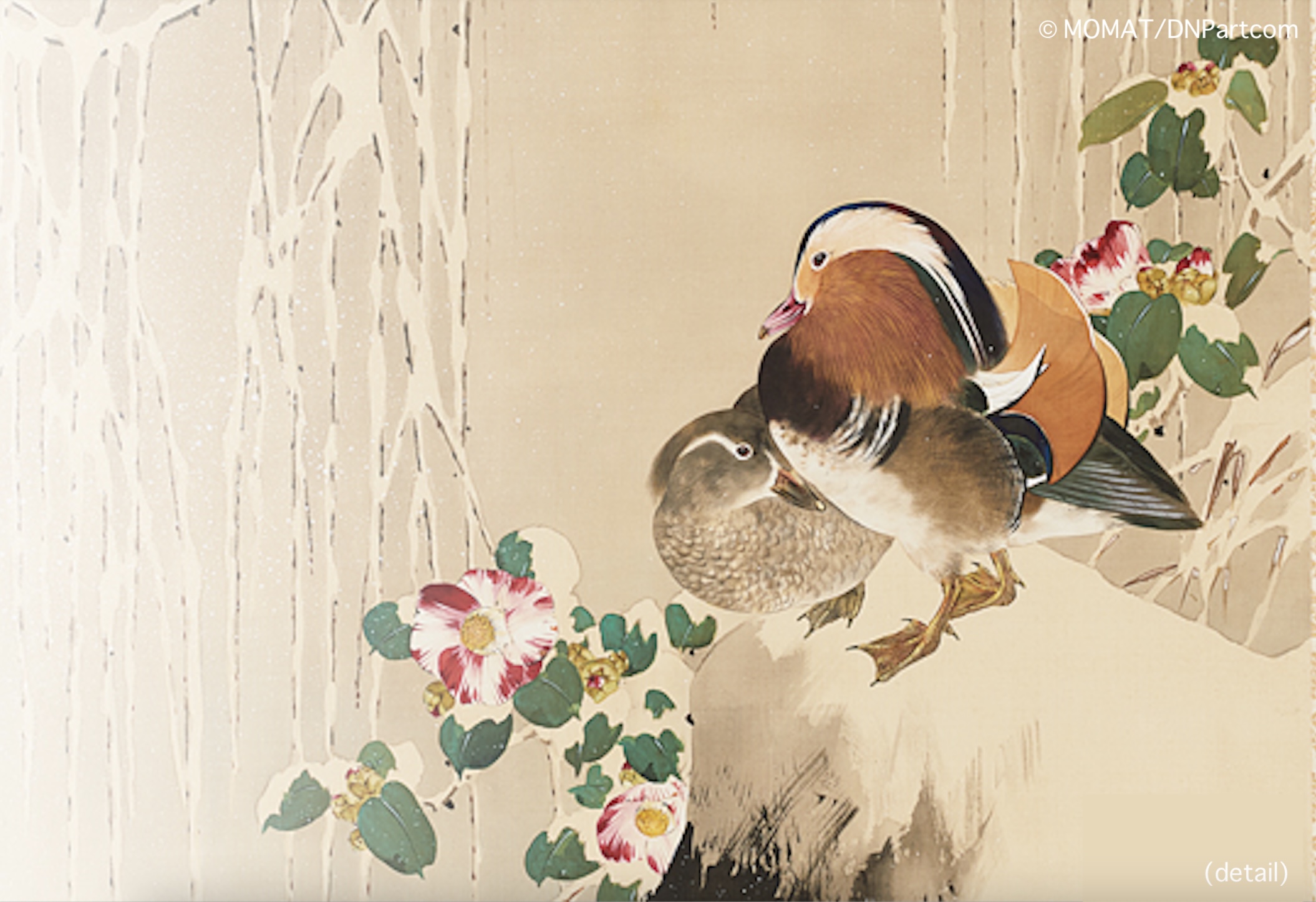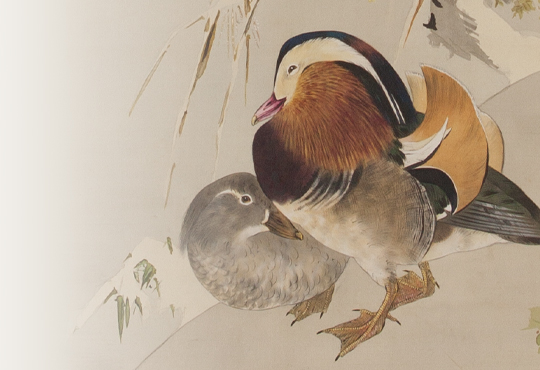 The Baikal Teal is a small duck that lives only in East Asia, and flies to Japan mainly in the winter to the lakes and marshes by the Sea of Japan. They are often seen alone or in other duck groups, but their large flock is very rare. They used to be a common specifies, but now they are perceived as quite unusual and listed as ‘Vulnerable’ on the Red List of endangered species by the Ministry of the Environment. The beauty of their colorful feather and peculiar facial pattern on their face inspired, both, their Japanese name and many artists. In addition to the aforementioned work, “Hibiscus and Ducks”, there are many other works that depict the Baikal Teal, such as Maruyama Okyo’s “Waterfowls and Chrysanthemums” (The Kyoto National Museum) and “Koi Fish and Ducks” (The Matsuoka Museum of Art), as well as Imao Keinen’s “Reeds and Water Birds” (The Museum of Modern Art, Shiga). Perhaps they are an essential subject of bird-and-flower paintings.