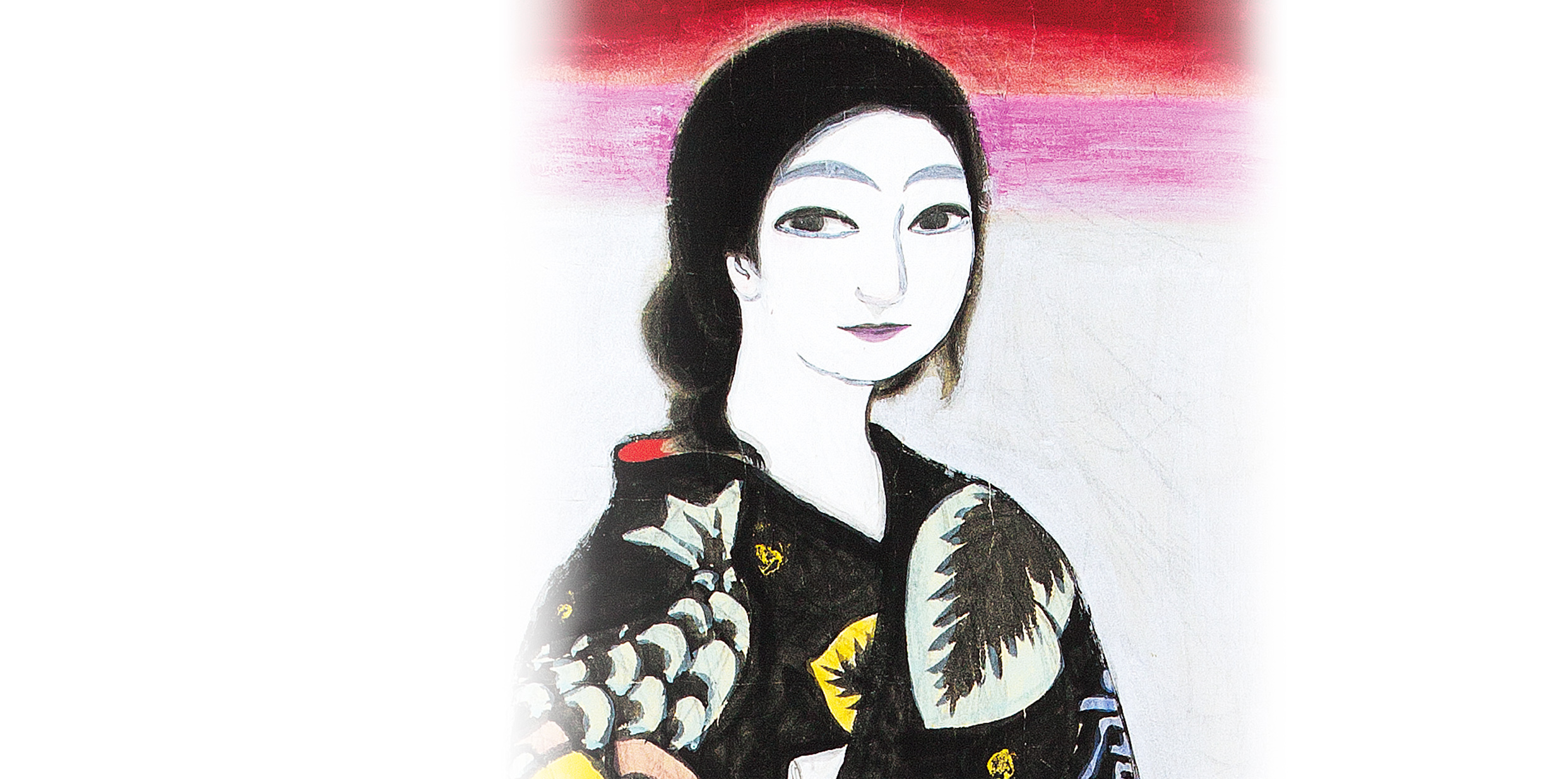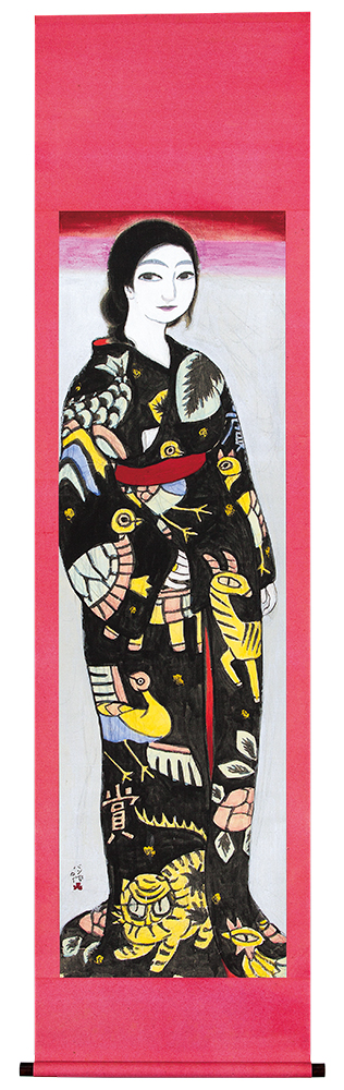 The kimono in this work is quite deformed, so it is hard to tell whether its pattern is an embroidery or Yuzen (resist dyeing), but I feel a sense of modernism especially in the roses of these Chinese mythology inspired motifs.