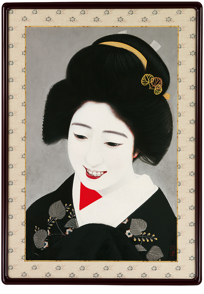 However, as I looked more closely, my impression gradually changed. From each strand of hair to her pink skin below her hairline and areas where there is an absence of makeup, I was drawn further and further into the realistic aspects of the work. At first glance, I thought she appeared androgynous, but, when I saw the work in person, her small front teeth, fluffy eyebrows, round nose, and hollyhock-pattered kimono, hairpin, and such made her look rather cute.