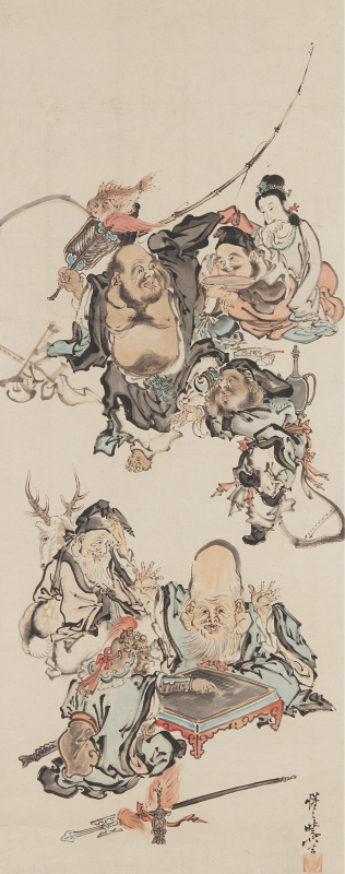 Kawanabe Kyosai grew up in Edo. He studied Kano school painting and, following graduation, gained popularity through the caricatures and nishiki-e (colored woodblock prints) he began creating towards the end of the Edo period. In the west, he is best known for his ukio-e and caricatures. His works often center upon ideas of “rebellion” and “satire”. Sharp and armed with extraordinary artistic talent, the impact of Kyosai’s satirical works has proved to increase over the increment of time. Amongst his pupils was Josiah Conder, an architect best known for his many designs of modern Japanese landmarks, i.e. Rokumeikan.