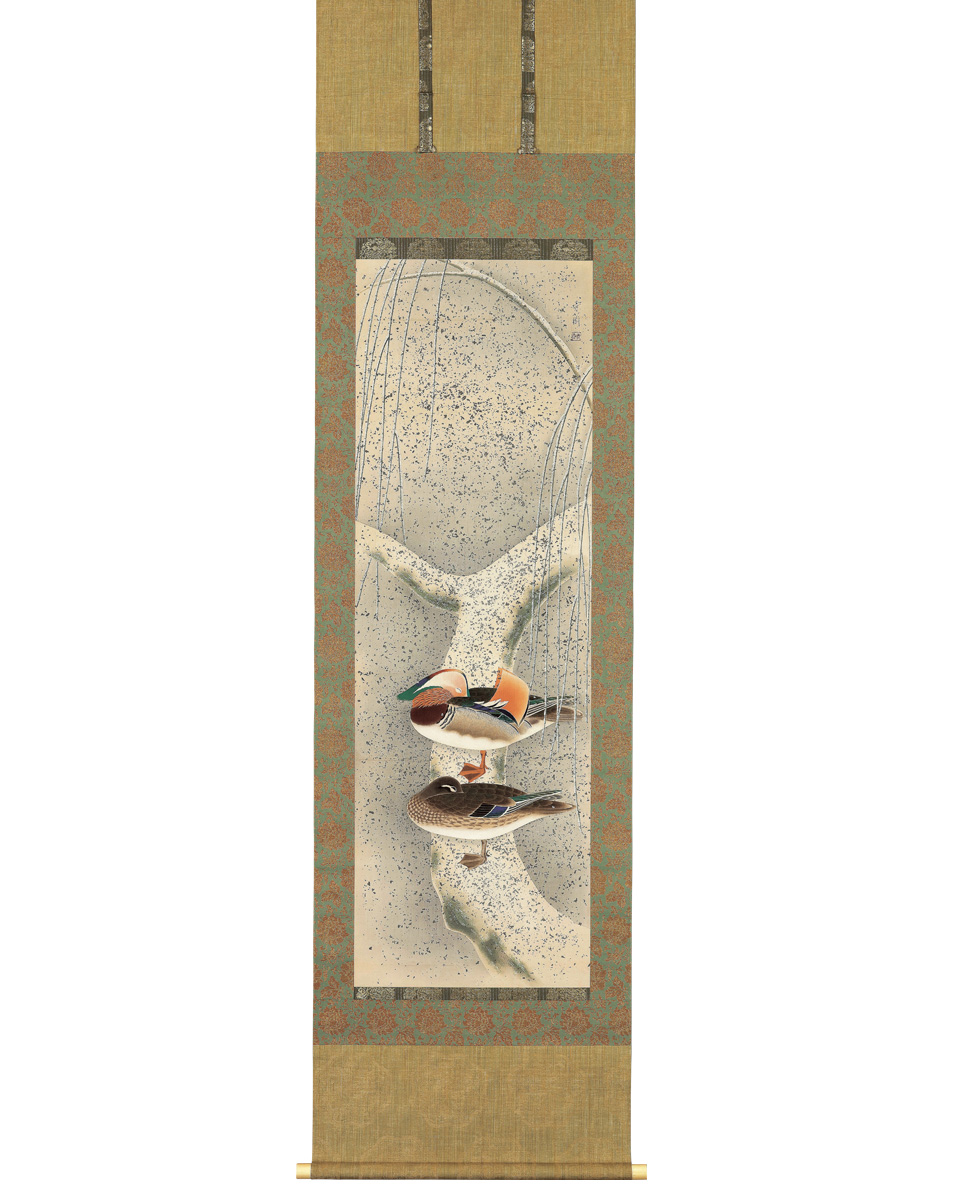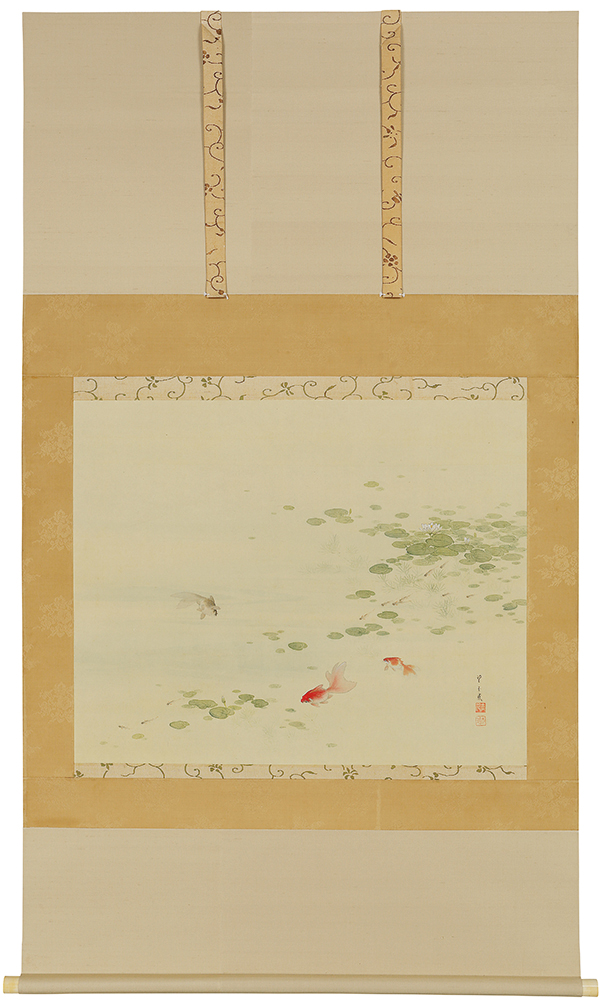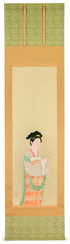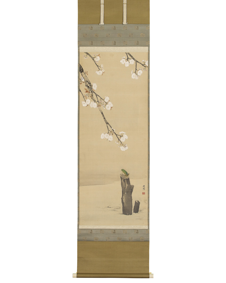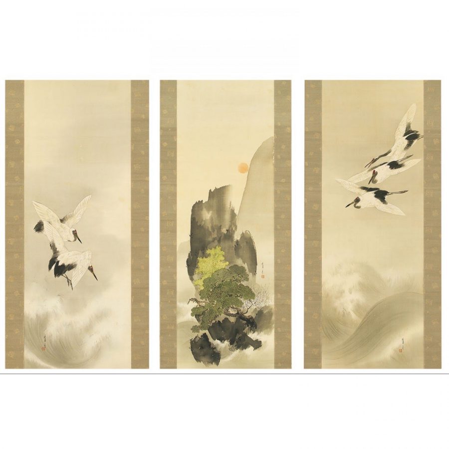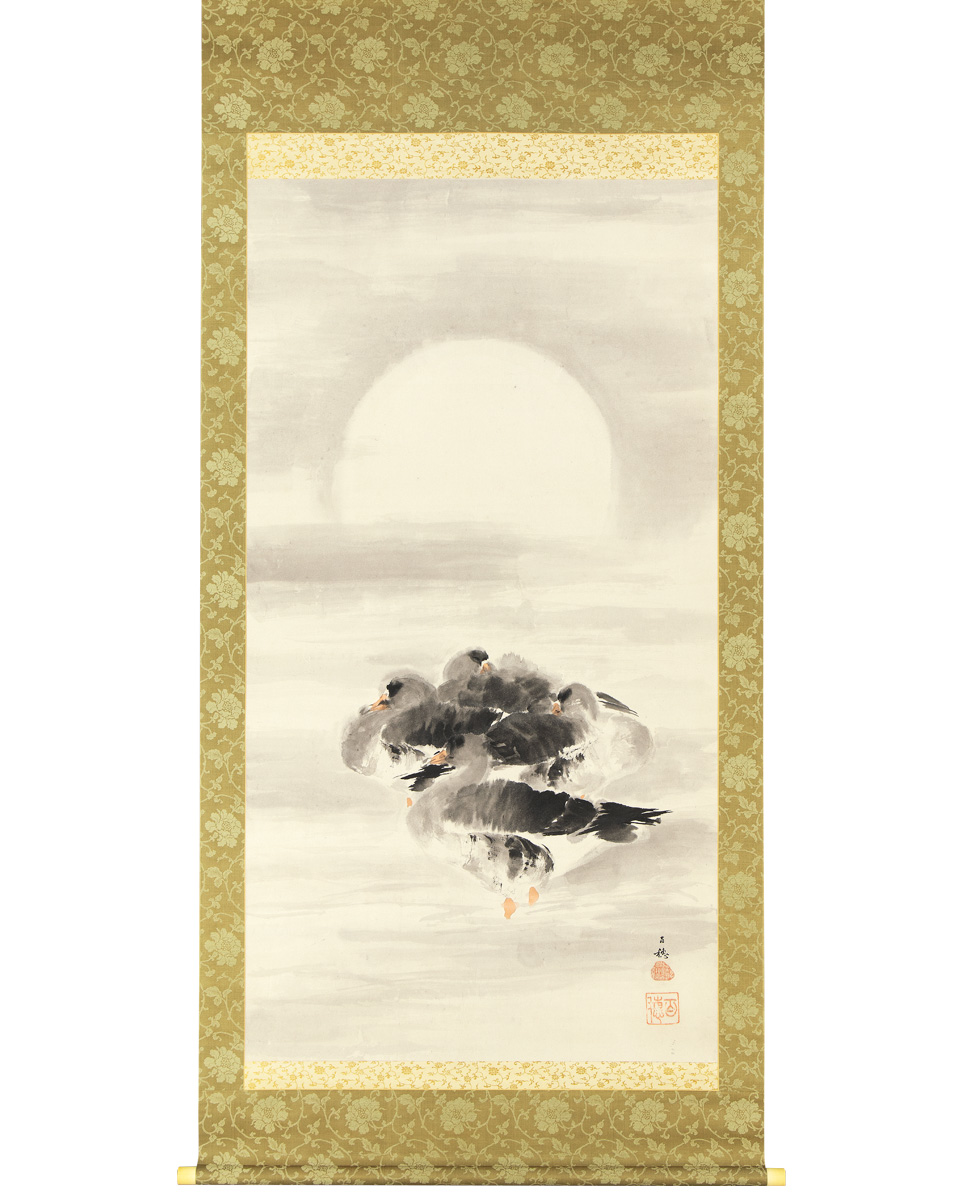 He began painting in his forties and mastered techniques that created a soft, blurred effect through the use of brushstrokes, often employing fudekusa (Japanese sedge). In this work, he depicts a tranquil landscape where the sharpness of the trees and the freshness of the mountain air are conveyed through the texture of his brushwork.