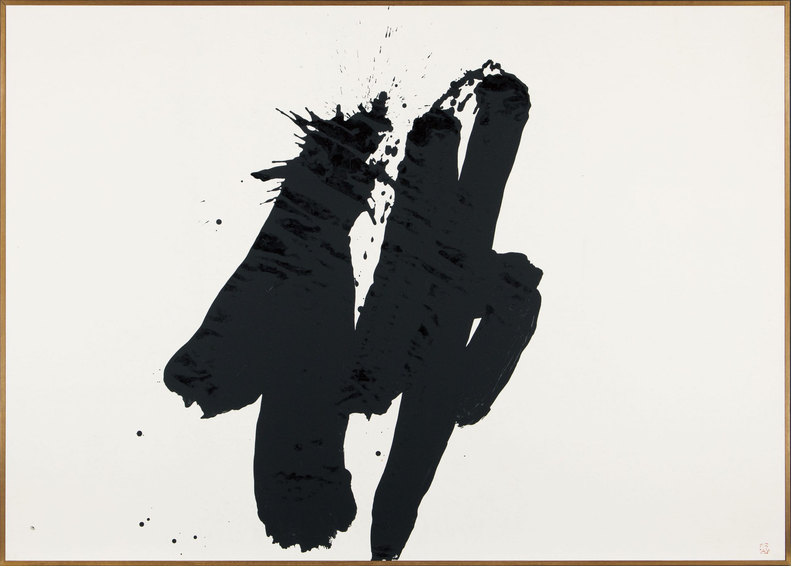 書の世界に新風を巻き起こした、前衛書を代表する一人です。上田桑鳩に師事し、墨人会を結成。それまでの書の概念を塗り替え、書を芸術作品へと昇華させました。墨で書かれた豪快なラインは前衛的で、海外でも、ニューヨーク近代美術館での「Japanese Calligraphy」展、サンパウロ・ビエンナーレ、ドクメンタ2などに参加し、高く評価されました。