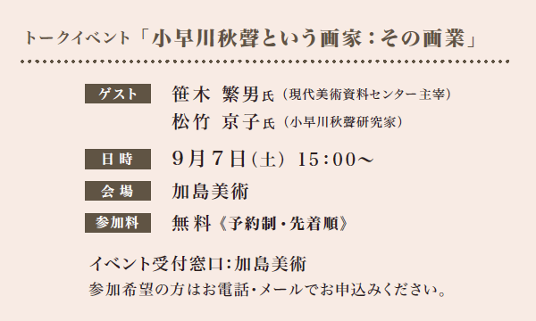 小早川秋聲研究者の松竹京子先生と現代美術資料センターを主宰する笹木繁男先生をお招きし、トークイベントを開催します。知られざる小早川秋聲の魅力を存分に語っていただきます。