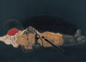陸軍からの依頼で制作された作品ながら、完成後同省から受け取りを拒否されたというエピソードを持つ小早川の代表作を展示いたします。この作品のように直接的に兵士の死を悼む作品を描くことは、当時の他の従軍画家達が華々しく活躍する兵士の姿を描いてきたことと非常に対照的です。後世の私達の胸にも生々しく迫る力を持つ本作は、小早川秋聲を象徴するような作品でもあります。故・高畑勲監督をして「いまもなお、生き残った者としての私たちを、そしてその子孫としての私たちを震撼させ続けている(高畑勲『一枚の絵から/日本編』株式会社岩波書店2009年11月27日初版より引用)」と言わしめた本作。ぜひこの機会に実物をご覧になってください。