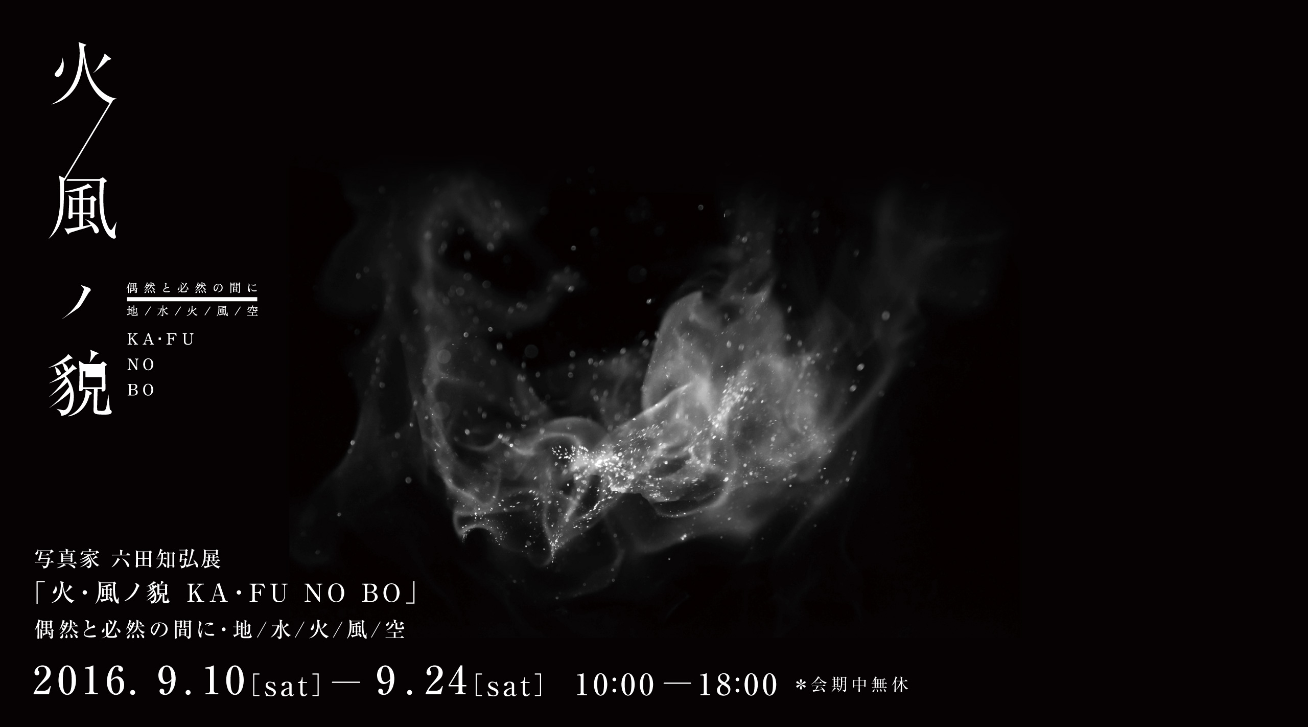 日本人は古来より自然界の万物に神秘性を見いだし、信仰や畏怖の念を持つ対象として捉えてきました。本企画はその日本人独自の自然観・思想を背景に、新たな表現を試みる写真家 六田知弘氏の連続企画です。全体のテーマは「宇宙を構成する五大原素 - 地水火風空」とし、日本人の自然観、自然信仰を背景に撮影した作品を展示致します。最終章となる本展では「火・風」の神秘性とエネルギーに満ちあふれた世界を約30点展示、販売致します。