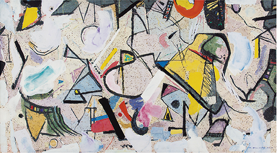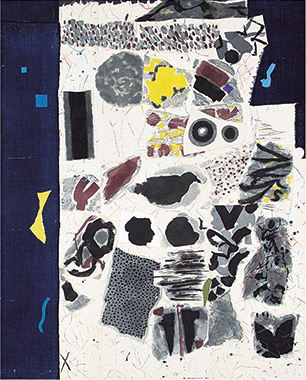 1960年頃に具象から抽象へ転換した以後は、画面上での意想外の組み合わせを試み、色彩豊かにリズミカルな作風を展開、代名詞となるコラージュへ到達します。