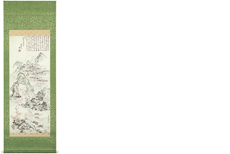 日本文人画の祖・池大雅の画に、儒学者・中井履軒による「桃花源記」についての賛が寄せられている。本作は、大雅自身の登山をよくした経験を踏まえて、独自の遠近感と俯瞰的な構図で描かれている。山々は渇筆を重ねた輪郭線で立体感を表し、藍と代赭を施すことで山肌の陰影を付している。また、満開の桜花は朱の点描により生動感に富み、画面から香るようである。その中を省筆で描かれた川はゆったりと流れ、観る者を桃源郷へと誘う。大雅は詩人・陶淵明による「桃花源記」の場面により、心の中に存在している文人画の本質を表現しているのではないだろうか。